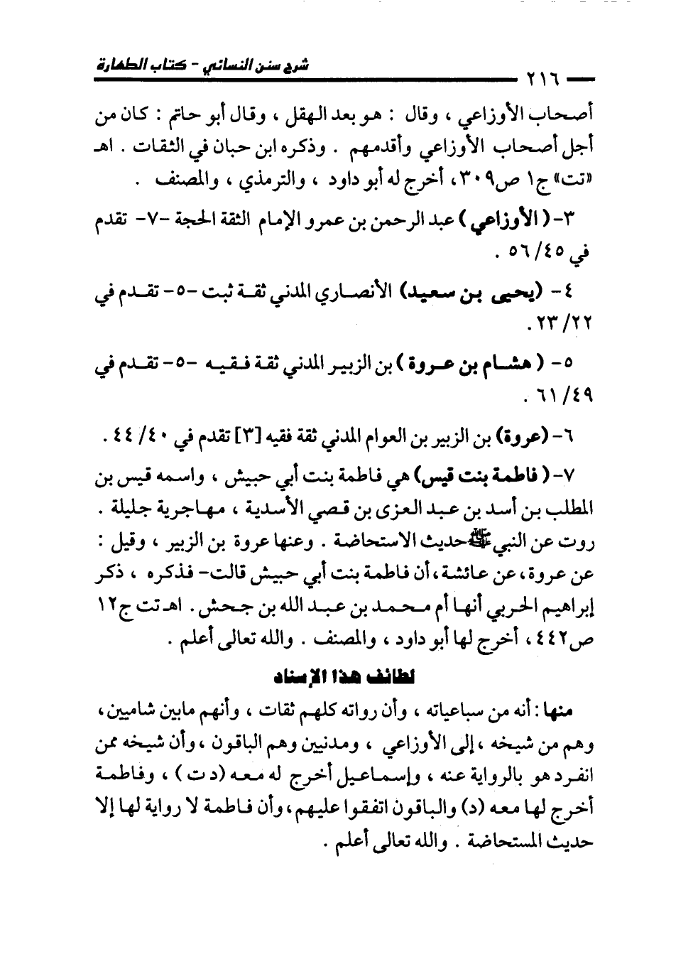 منها: أنه من سباعياته، وأن رواته كلهم ثقات، وأنهم ما بين شاميين، وهم من شيخه، إلى الأوزاعي، ومدنيين وهم الباقون، وأن شيخه ممن انفرد هو بالرواية عنه، وإسماعيل أخرج له معه (د ت)، وفاطمة أخرج لها معه (د) والباقون اتفقوا عليهم، وأن فاطمة لا رواية لها إلا حديث المستحاضة. والله تعالى أعلم.