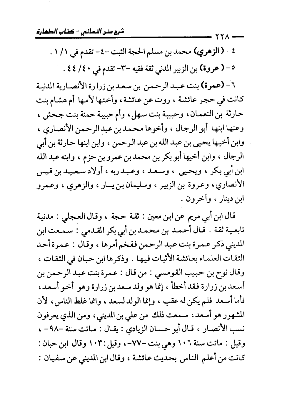 6 - (عمرة) بنت عبد الرحمن بن سعد بن زرارة الأنصارية المدنية كانت في حجر عائشة، روت عن عائشة، وأختها لأمها أم هشام بنت حارثة بن النعمان، وحبيبة بنت سهل، وأم حبيبة حمنة بنت جحش، وعنها ابنها أبو الرجال، وأخوها محمَّد بن عبد الرحمن الأنصاري، وابن أخيها يحيى بن عبد الله بن عبد الرحمن، وابن ابنها حارثة بن أبي الرجال، وابن أخيها أبو بكر بن محمَّد بن عمرو بن حزم، وابنه عبد الله ابن أبي بكر، ويحيى، وسعد، وعبد ربه، أولاد سعيد بن قيس الأنصاري، وعروة بن الزبير، وسليمان بن يسار، والزهري، وعمرو ابن دينار، وآخرون.