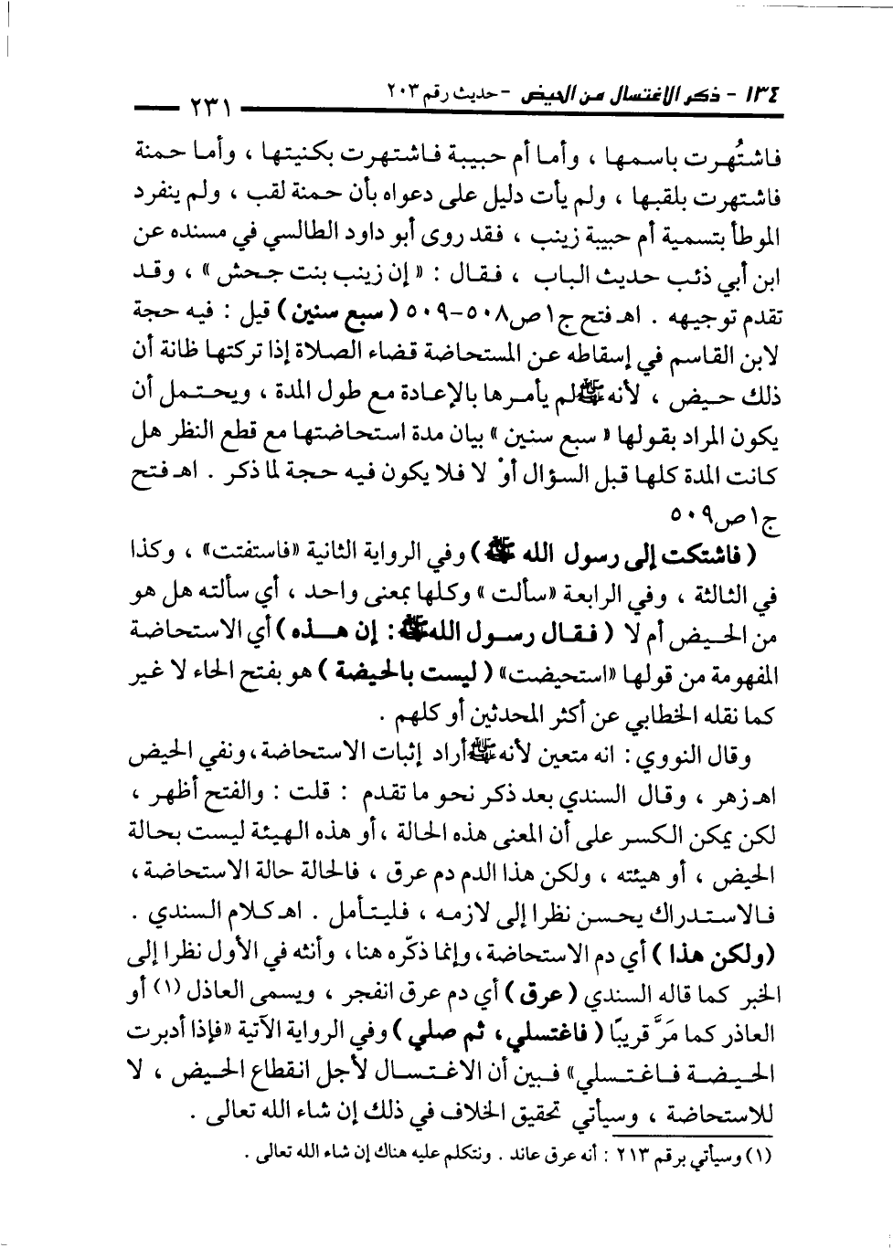فاشتُهرت باسمها، وأما أم حبيبة فاشتهرت بكنيتها، وأما حمنة فاشتهرت بلقبها, ولم يأت دليل على دعواه بأن حمنة لقب، ولم ينفرد الموطأ بتسمية أم حبيبة زينب، فقد روى أبو داود الطيالسي في مسنده عن ابن أبي ذئب حديث الباب، فقال: "إن زينب بنت جحش"، وقد تقدم توجيهه. اهـ فتح ج 1 ص 508 - 509 (سبع سنين) قيل: فيه حجة لابن القاسم في إسقاطه عن المستحاضة قضاء الصلاة إذا تركتها ظانة أن ذلك حيض, لأنه - صلى الله عليه وسلم - لم يأمرها بالإعادة مع طول المدة، ويحتمل أن يكون المراد بقولها "سبع سنين" بيان مدة استحاضتها مع قطع النظر هل كانت المدة كلها قبل السؤال أوْ لا فلا يكون فيه حجة لما ذكر. اهـ فتح ج 1 ص 509.