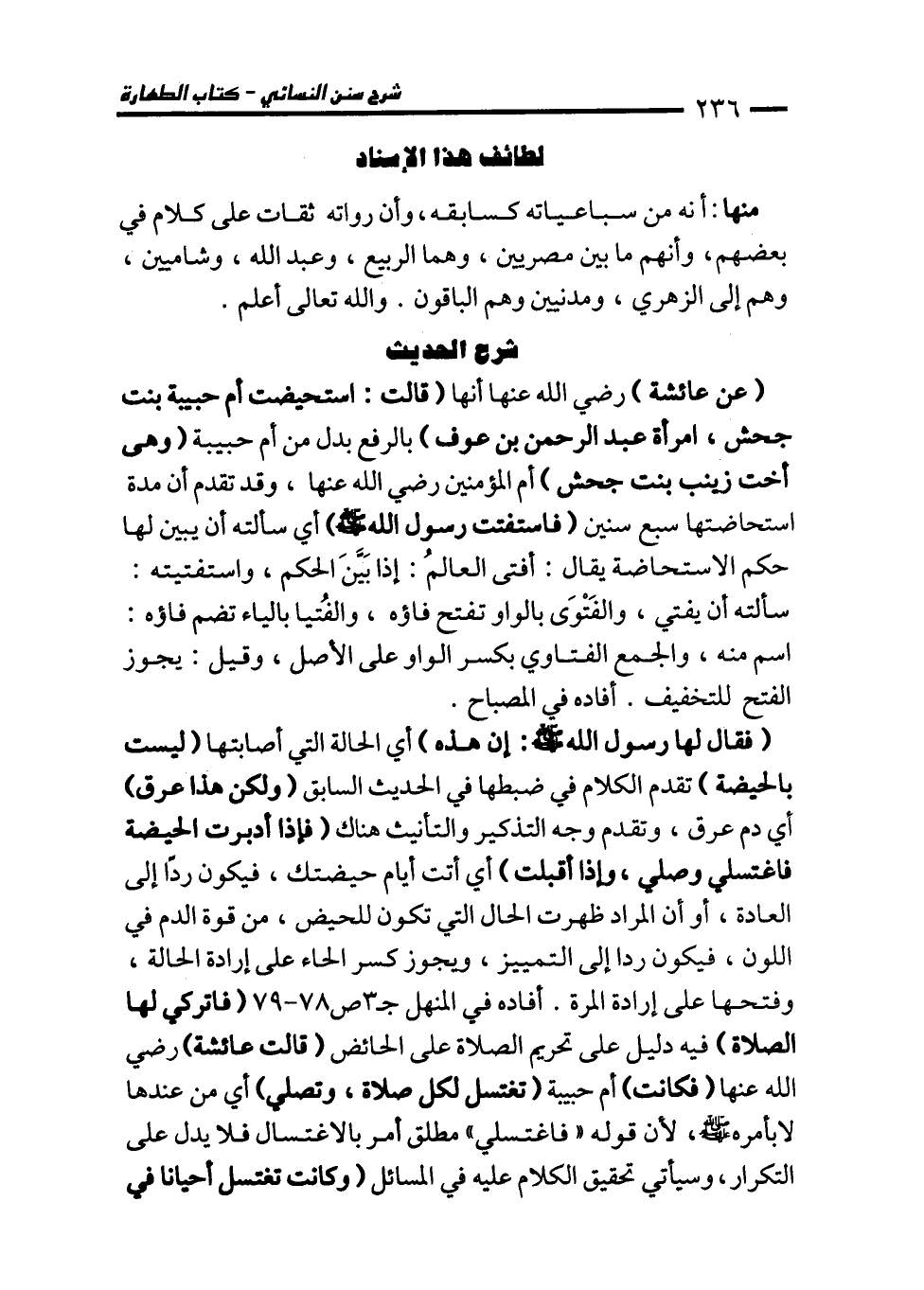 (عن عائشة) رضي الله عنها أنها (قالت: استحيضت أم حبيية بنت جحش، امرأة عبد الرحمن بن عوف) بالرفع بدل من أم حبيبة (وهي أخت زينب بنت جحش) أم المؤمنين رضي الله عنها، وقد تقدم أن مدة استحاضتها سبع سنين (فاستفتت رسول الله - صلى الله عليه وسلم -) أي سألته أن يبين لها حكم الاستحاضة يقال: أفتى العالمُ: إذا بَيَّنَ الحكم، واستفتيته: سألته أن يفتي، والفَتْوَى بالواو تفتح فاؤه، والفُتيا بالياء تضم فاؤه: اسم منه، والجمع الفتاوي بكسر الواو على الأصل، وقيل: يجوز الفتح للتخفيف. أفاده في المصباح.