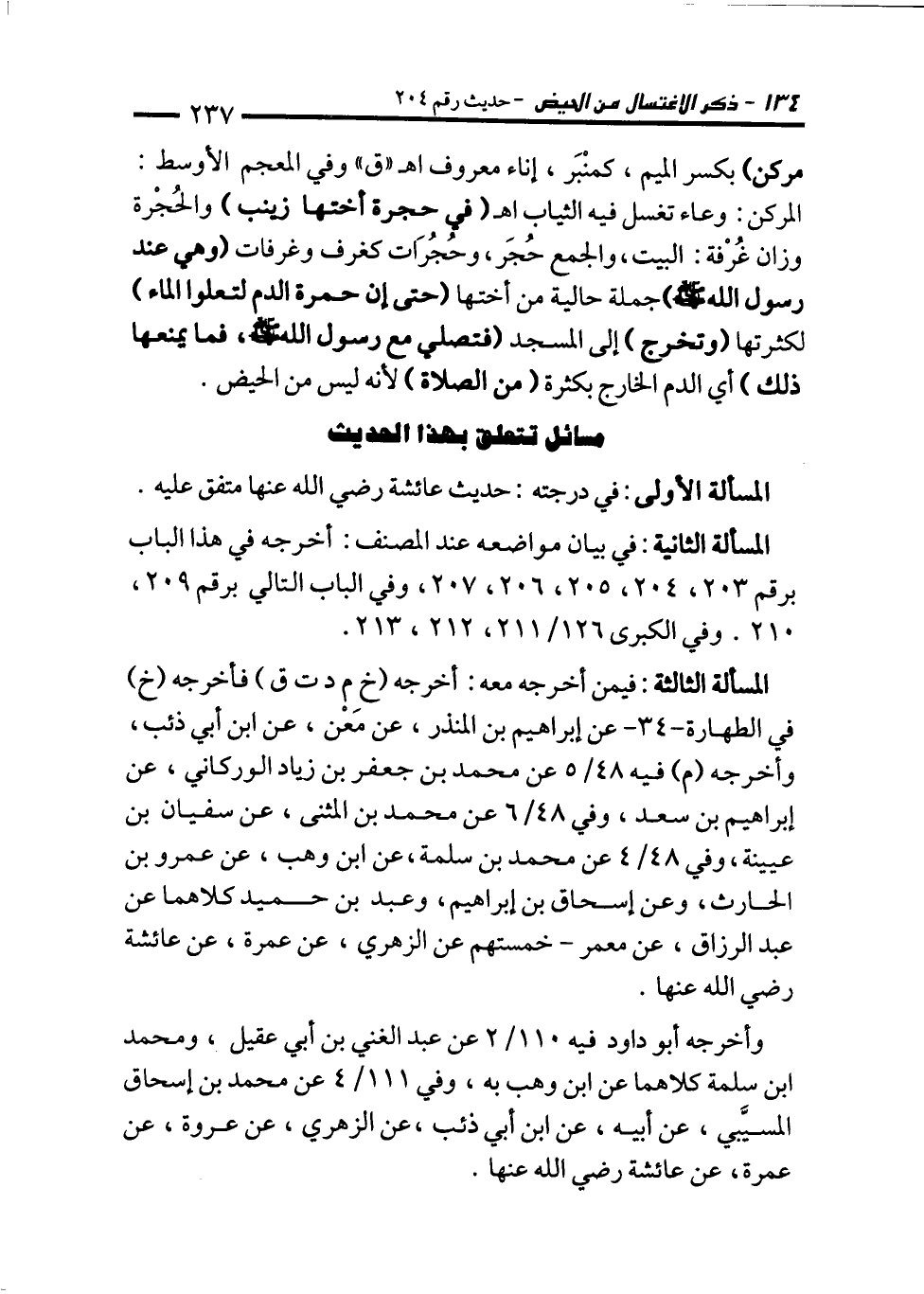 مركن) بكسر الميم، كمنْبَر، إناء معروف اهـ "ق" وفي المعجم الأوسط: المركن: وعاء تغسل فيه الثياب اهـ (في حجرة أختها زينب) والحُجْرة وزان غُرْفة: البيت، والجمع حُجَر، وحُجُرَات كغرف وغرفات (وهي عند رسول الله - صلى الله عليه وسلم -) جملة حالية من أختها (حتى إن حمرة الدم لتعلوا الماء) لكثرتها (وتخرج) إلى المسجد (فتصلي مع رسول الله - صلى الله عليه وسلم -، فما يمنعها ذلك) أي الدم الخارج بكثرة (من الصلاة) لأنه ليس من الحيض.
