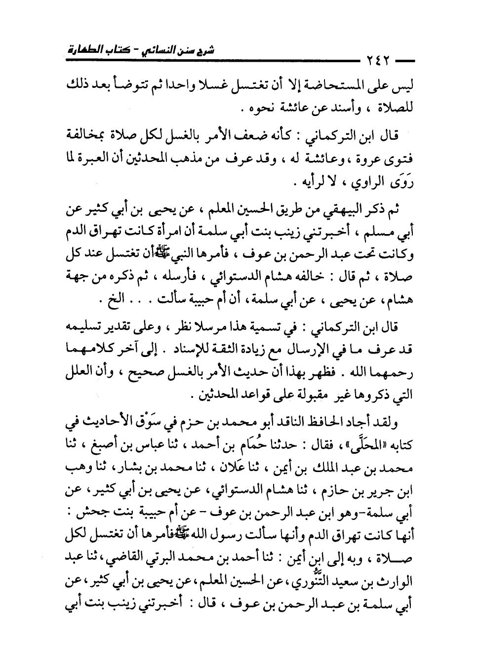 ولقد أجاد الحافظ الناقد أبو محمَّد بن حزم في سَوْق الأحاديث في كتابه "المحَلَّى"، فقال: حدثنا حُمَام بن أحمد، ثنا عباس بن أصبغ، ثنا محمَّد بن عبد الملك بن أيمن، ثنا عَلان، ثنا محمَّد بن بشار، ثنا وهب ابن جرير بن حازم، ثنا هشام الدستوائي، عن يحيى بن أبي كثير، عن أبي سلمة -وهو ابن عبد الرحمن بن عوف- عن أم حبيبة بنت جحش: أنها كانت تهراق الدم وأنها سألت رسول الله - صلى الله عليه وسلم - فأمرها أن تغتسل لكل صلاة، وبه إلى ابن أيمن: ثنا أحمد بن محمَّد البرتي القاضي، ثنا عبد