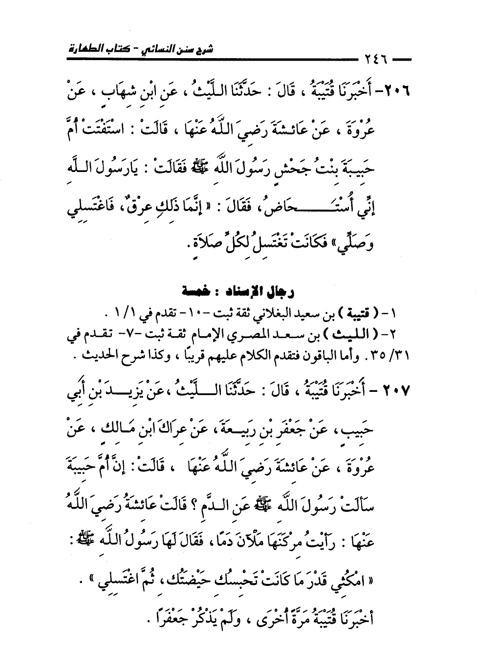 207 - أَخْبَرَنَا قُتَيْبَةُ، قَالَ: حَدَّثَنَا اللَّيْثُ، عَنْ يَزِيدَ بْنِ أَبِي حَبِيبٍ، عَنْ جَعْفَرِ بْنِ رَبِيعَةَ، عَنْ عِرَاكِ بْنِ مَالِكٍ، عَنْ عُرْوَةَ، عَنْ عَائِشَةَ رَضِيَ اللهُ عَنْهَا، قَالَتْ: أَنَّ أُمَّ حَبِيبَةَ سَأَلَتْ رَسُولَ اللهِ - صلى الله عليه وسلم - عَنِ الدَّمِ؟ قَالَتْ عَائِشَةُ رَضِيَ اللهُ عَنْهَا: رَأَيْتُ مِرْكَنَهَا مَلآنَ دَمًا، فَقَالَ لَهَا رَسُولُ اللهِ - صلى الله عليه وسلم -: "امْكُثِي قَدْرَ مَا كَانَتْ تَحْبِسُكِ حَيْضَتُكِ، ثُمَّ اغْتَسِلِي".