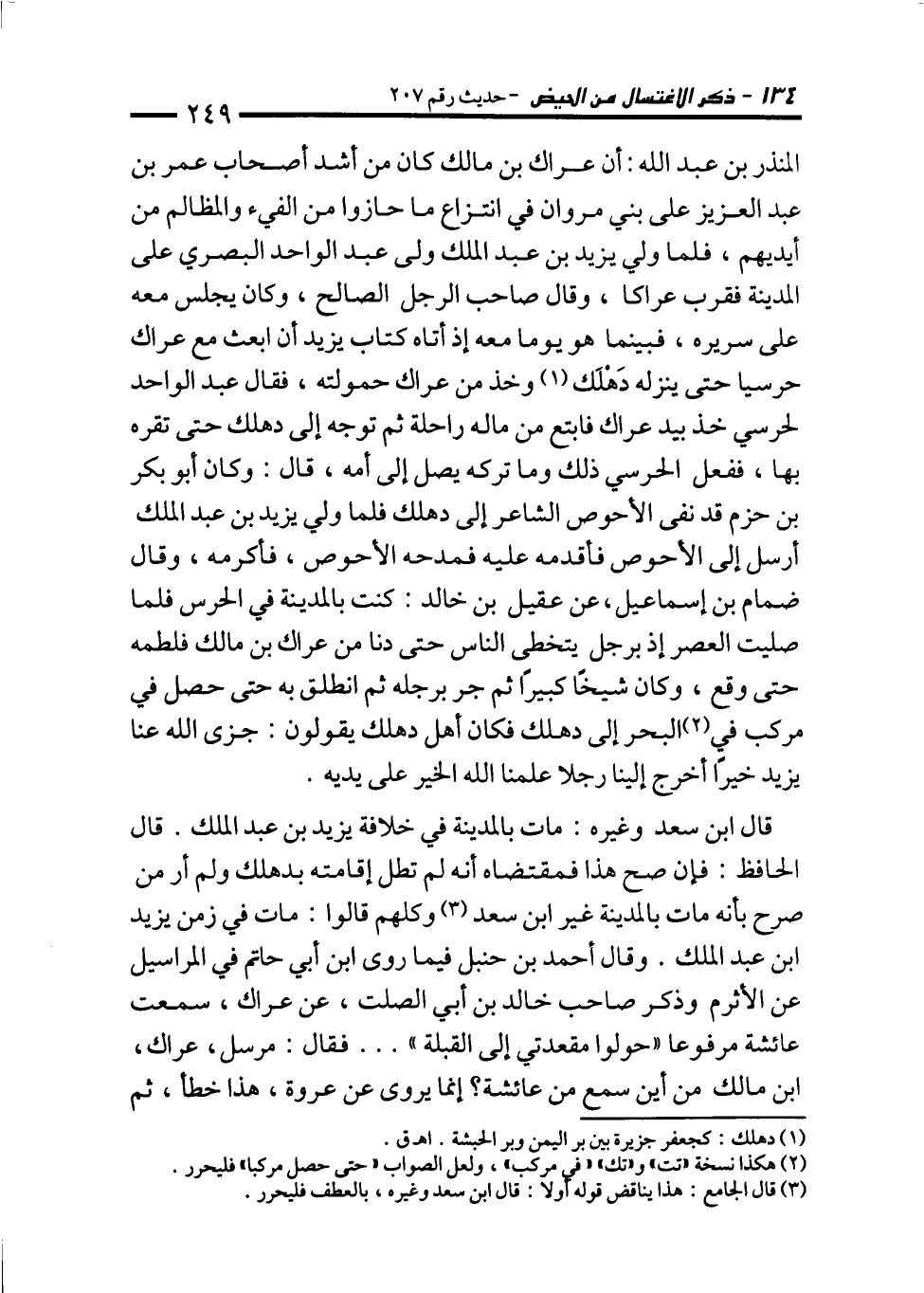 قال ابن سعد وغيره: مات بالمدينة في خلافة يزيد بن عبد الملك. قال الحافظ: فإن صح هذا فمقتضاه أنه لم تطل إقامته بدهلك ولم أر من صرح بأنه مات بالمدينة غير ابن سعد (¬3) وكلهم قالوا: مات في زمن يزيد ابن عبد الملك. وقال أحمد بن حنبل فيما روى ابن أبي حاتم في المراسيل عن الأثرم وذكر صاحب خالد بن أبي الصلت، عن عراك، سمعت عائشة مرفوعا "حولوا مقعدتي إلى القبلة" ... فقال: مرسل، عراك، ابن مالك من أين سمع من عائشة؟ إنما يروى عن عروة، هذا خطأ، ثم