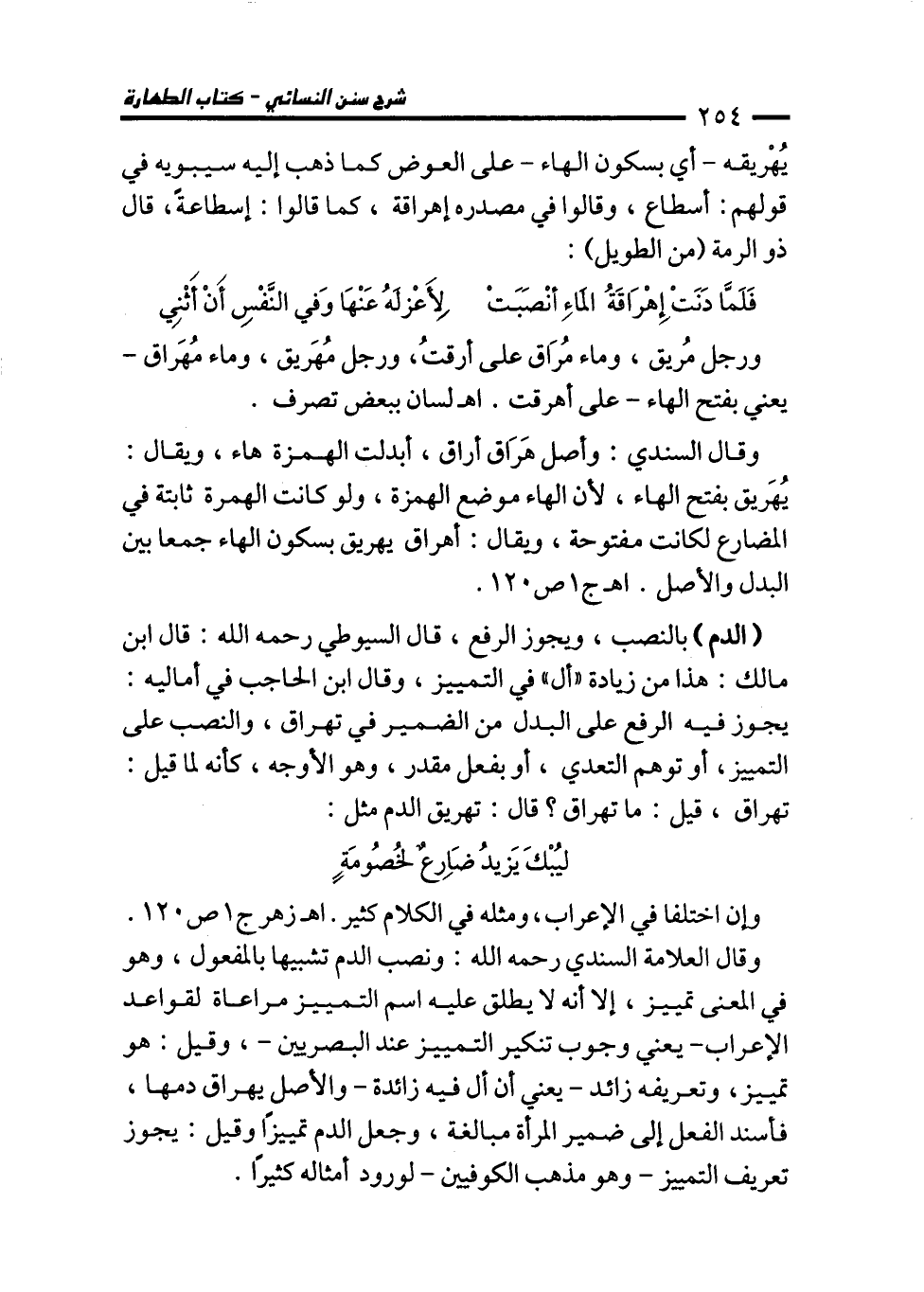 وقال العلامة السندي رحمه الله: ونصب الدم تشبيها بالمفعول، وهو في المعنى تمييز، إلا أنه لا يطلق عليه اسم التمييز مراعاة لقواعد الإعراب -يعني وجوب تنكير التمييز عند البصريين-، وقيل: هو تمييز، وتعريفه زائد -يعني أن أل فيه زائدة- والأصل يهراق دمها، فأسند الفعل إلى ضمير المرأة مبالغة، وجعل الدم تمييزًا وقيل: يجوز تعريف التمييز -وهو مذهب الكوفيين- لورود أمثاله كثيرًا.