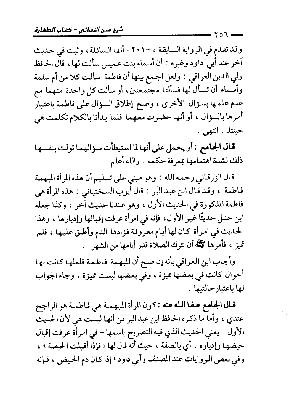 قال الجامع عفا الله عنه: كون المرأة المبهمة هي فاطمة هو الراجح عندي، وأما ما ذكره الحافظ ابن عبد البر من أنها ليست هي لأن الحديث الأول -يعني الحديث الذي فيه التصريح باسمها- في امرأة عرفت إقبال حيضها وإدباره، أي بالصفة، حيث أنه قال لها "فإذا أقبلت الحيضة"، وفي بعض الروايات عند المصنف وأبي داود "إذا كان دم الحيض، فإنه