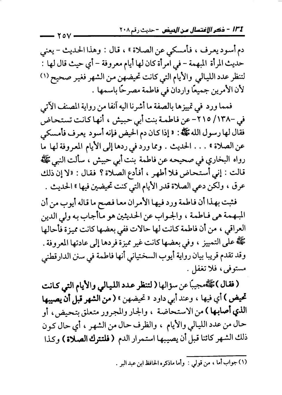 دم أسود يعرف، فأمسكي عن الصلاة"، قال: وهذا الحديث -يعني حديث المرأة المبهمة- في امرأة كان لها أيام معروفة -أي حيث قال لها: لتنظر عدد الليالي والأيام التي كانت تحيضهن من الشهر فغير صحيح (¬1) لأن الأمرين جميعًا واردان في فاطمة مصرحًا باسمها.