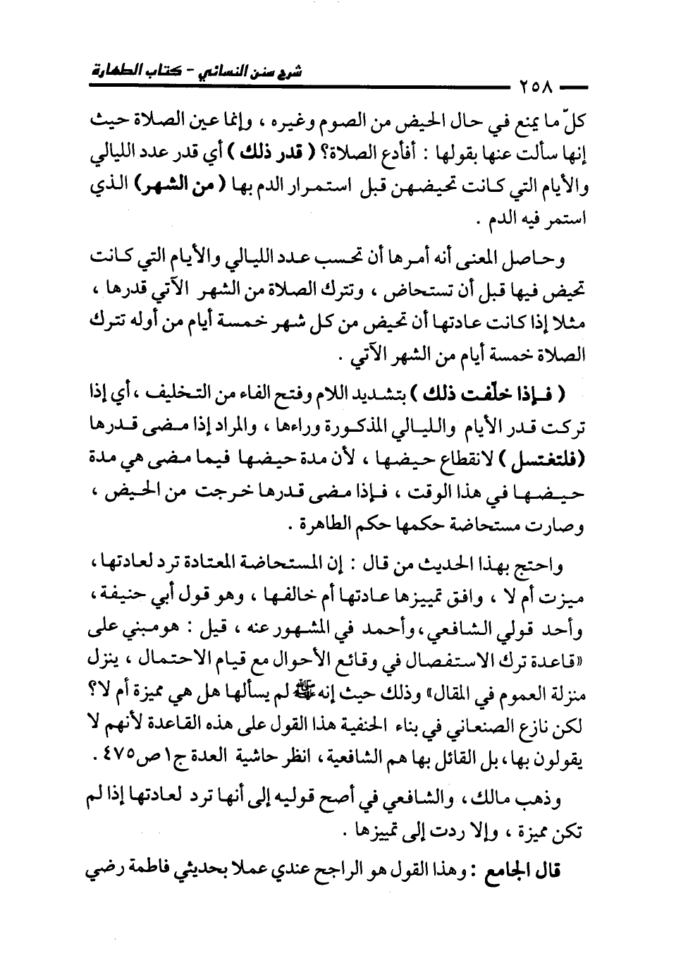 واحتج بهذا الحديث من قال: إن المستحاضة المعتادة ترد لعادتها، ميزت أم لا، وافق تمييزها عادتها أم خالفها، وهو قول أبي حنيفة، وأحد قولي الشافعي، وأحمد في المشهور عنه، قيل: هو مبني على "قاعدة ترك الاستفصال في وقائع الأحوال مع قيام الاحتمال، ينزل منزلة العموم في المقال" وذلك حيث إنه - صلى الله عليه وسلم - لم يسألها هل هي مميزة أم لا؟ لكن نازع الصنعاني في بناء الحنفية هذا القول على هذه القاعدة لأنهم لا يقولون بها، بل القائل بها هم الشافعية، انظر حاشية العدة ج 1 ص 475.