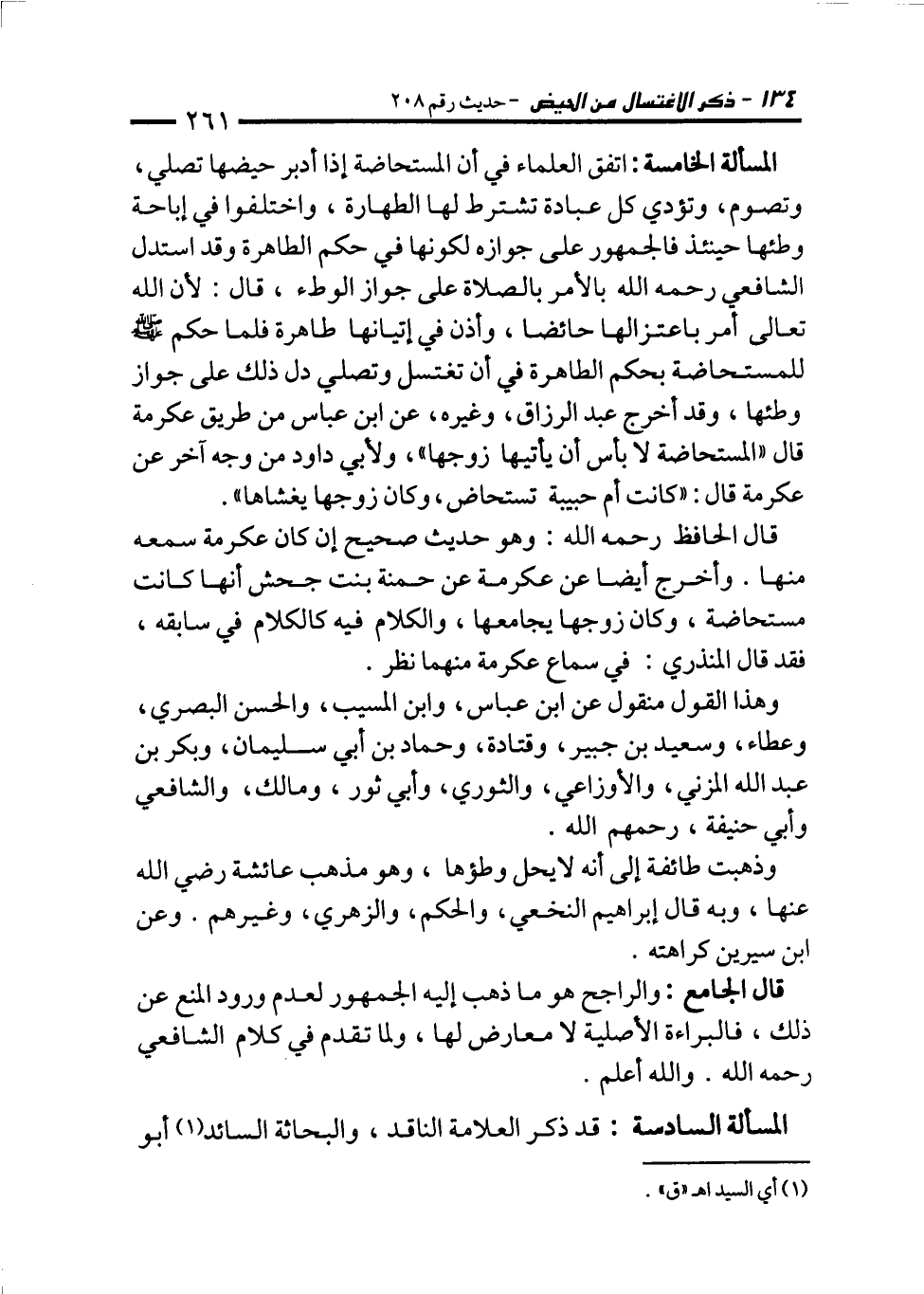 المسألة الخامسة: اتفق العلماء في أن المستحاضة إذا أدبر حيضها تصلي، وتصوم، وتؤدي كل عبادة تشترط لها الطهارة، واختلفوا في إباحة وطئها حينئذ فالجمهور على جوازه لكونها في حكم الطاهرة وقد استدل الشافعي رحمه الله بالأمر بالصلاة على جواز الوطء، قال: لأن الله تعالى أمر باعتزالها حائضا، وأذن في إتيانها طاهرة فلما حكم - صلى الله عليه وسلم - للمستحاضة بحكم الطاهرة في أن تغتسل وتصلي دل ذلك على جواز وطئها، وقد أخرج عبد الرزاق، وغيره، عن ابن عباس من طريق عكرمة قال "المستحاضة لا بأس أن يأتيها زوجها"، ولأبي داود من وجه آخر عن عكرمة قال: "كانت أم حبيبة تستحاض، وكان زوجها يغشاها".