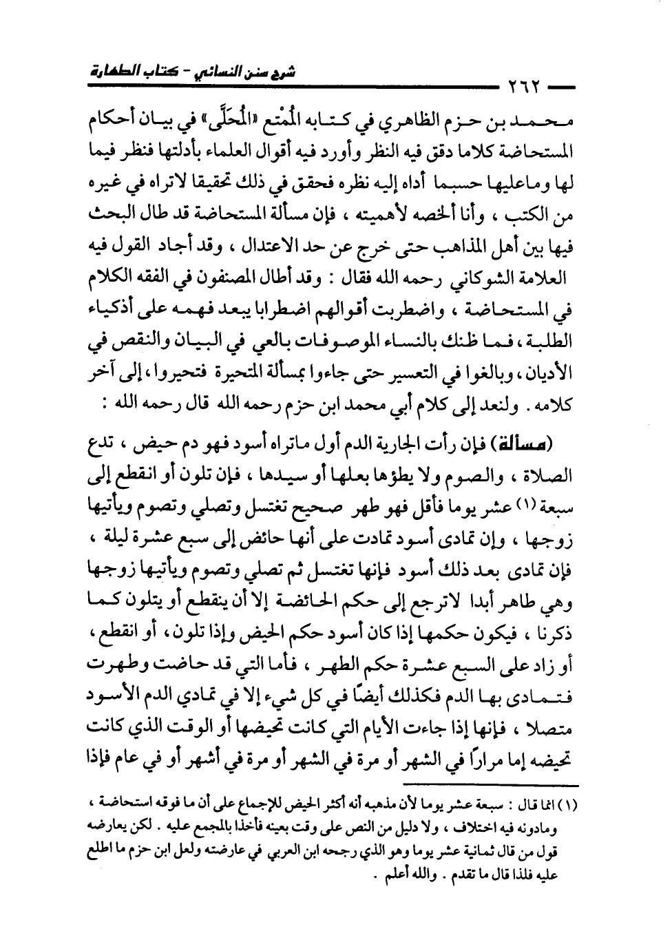 محمَّد بن حزم الظاهري في كتابه المُمْتع "المُحَلَّى" في بيان أحكام المستحاضة كلاما دقق فيه النظر وأورد فيه أقوال العلماء بأدلتها فنظر فيما لها وما عليها حسبما أداه إليه نظره فحقق في ذلك تحقيقا لا تراه في غيره من الكتب، وأنا ألخصه لأهميته، فإن مسألة المستحاضة قد طال البحث فيها بين أهل المذاهب حتى خرج عن حد الاعتدال، وقد أجاد القول فيه العلامة الشوكاني رحمه الله فقال: وقد أطال المصنفون في الفقه الكلام في المستحاضة، واضطربت أقوالهم اضطرابا يبعد فهمه على أذكياء الطلبة، فما ظنك بالنساء الموصوفات بالعي في البيان والنقص في الأديان، وبالغوا في التعسير حتى جاءوا بمسألة المتحيرة فتحيروا، إلى آخر كلامه. ولنعد إلى كلام أبي محمَّد ابن حزم رحمه الله قال رحمه الله: