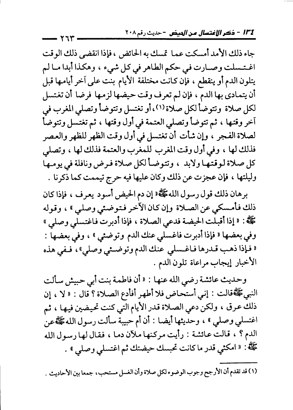 وحديث عائشة رضي الله عنها: "أن فاطمة بنت أبي حبيش سألت النبي - صلى الله عليه وسلم - قالت: إني أستحاض فلا أطهر أفأدع الصلاة؟ قال: "لا، إن ذلك عرق، ولكن دعي الصلاة قدر الأيام التي كنت تحيضين فيها، ثم اغتسلي وصلي"، وحديثها أيضا: أن أم حبيبة سألت رسول الله - صلى الله عليه وسلم - عن الدم؟، قالت عائشة: رأيت مركنها ملآن دما، فقال لها رسول الله - صلى الله عليه وسلم -: "امكثي قدر ما كانت تحبسك حيضتك ثم اغتسلي وصلي".