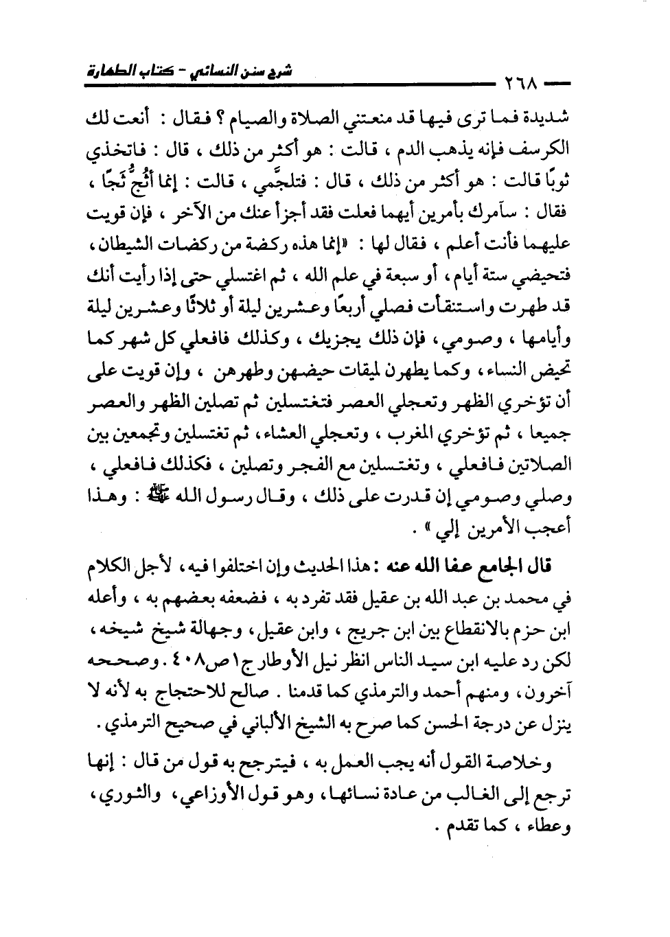 شديدة فما ترى فيها قد منعتني الصلاة والصيام؟ فقال: أنعت لك الكرسف فإنه يذهب الدم، قالت: هو أكثر من ذلك، قال: فاتخذي ثوبًا قالت: هو أكثر من ذلك، قال: فتلجَّمي، قالت: إنما أثُجُّ ثَجًا، فقال: سآمرك بأمرين أيهما فعلت فقد أجزأ عنك من الآخر، فإن قويت عليهما فأنت أعلم، فقال لها: "إنما هذه ركضة من ركضات الشيطان، فتحيضي ستة أيام، أو سبعة في علم الله، ثم اغتسلي حتى إذا رأيت أنك قد طهرت واستنقأت فصلي أربعًا وعشرين ليلة أو ثلاثًا وعشرين ليلة وأيامها، وصومي، فإن ذلك يجزيك، وكذلك فافعلي كل شهر كما تحيض النساء، وكما يطهرن لميقات حيضهن وطهرهن، وإن قويت على أن تؤخري الظهر وتعجلي العصر فتغتسلين ثم تصلين الظهر والعصر جميعا، ثم تؤخري المغرب، وتعجلي العشاء، ثم تغتسلين وتجمعين بين الصلاتين فافعلي، وتغتسلين مع الفجر وتصلين، فكذلك فافعلي، وصلي وصومي إن قدرت على ذلك، وقال رسول الله - صلى الله عليه وسلم -: وهذا أعجب الأمرين إلى".
