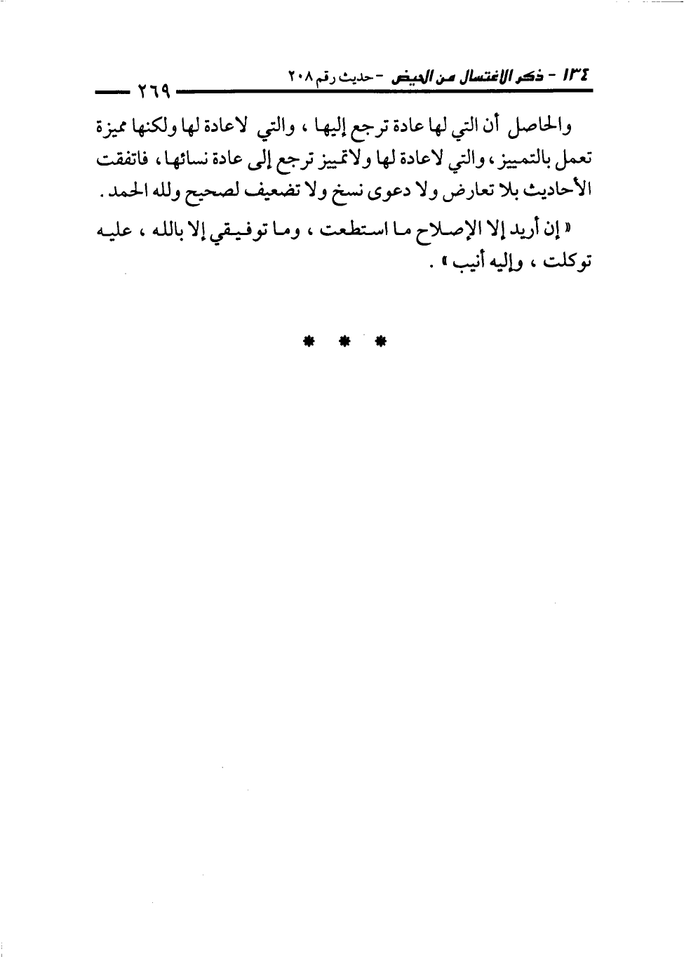 والحاصل أن التي لها عادة ترجع إليها، والتي لا عادة لها ولكنها مميزة تعمل بالتمييز، والتي لا عادة لها ولا تمييز ترجع إلى عادة نسائها، فاتفقت الأحاديث بلا تعارض ولا دعوى نسخ ولا تضعيف لصحيح ولله الحمد.