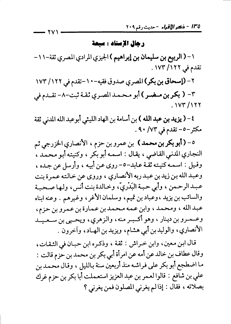 5 - (أبو بكر بن محمَّد) بن عمرو بن حزم، الأنصاري الخزرجي ثم النجاري المدني القاضي، يقال: اسمه أبو بكر، وكنيته أبو محمَّد، وقيل: اسمه كنيته ثقة عابد -5 - روى عن أبيه، وأرسل عن جده، وعبد الله بن زيد بن عبد ربه الأنصاري، وروى عن خالته عمرة بنت عبد الرحمن، وأبي حبَّة البَدْريّ، وخالدة بنت أنس، ولها صحبة والسائب بن يزيد، وعباد بن تميم، وسلمان الأغر، وغيرهم. وعنه ابناه عبد الله، ومحمد، وابن عمه محمَّد بن عمارة بن عمرو بن حزم، وعمرو بن دينار، وهو أكبر منه، والزهري، ويحيى بن سعيد الأنصاري، والوليد بن أبي هشام، ويزيد بن الهاد، وآخرون.