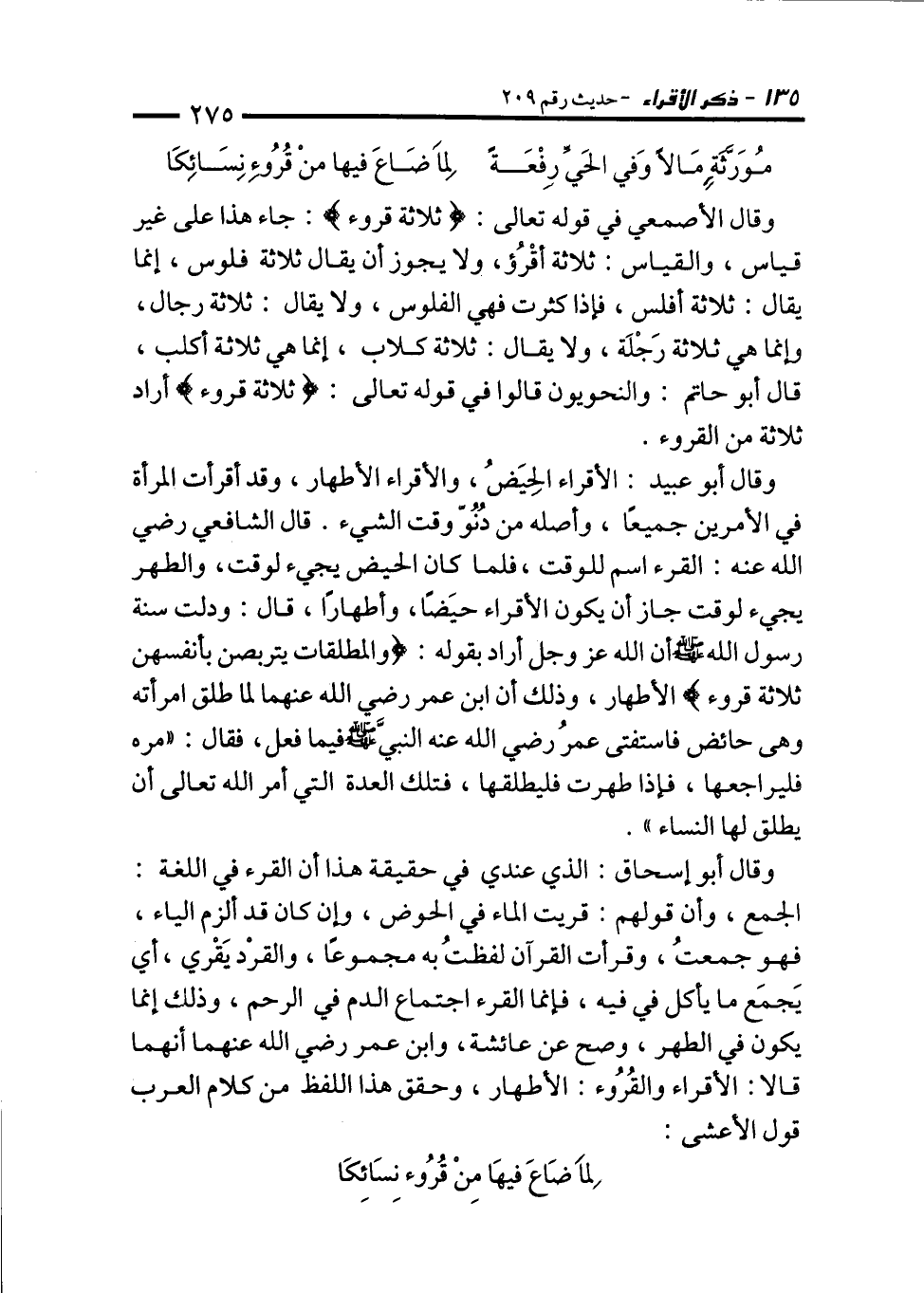 وقال أبو عبيد: الأقراء الحيَضُ، والأقراء الأطهار، وقد أقرأت المرأة في الأمرين جميعًا، وأصله من دُنُوّ وقت الشيء. قال الشافعي رضي الله عنه: القرء اسم للوقت، فلما كان الحيض يجيء لوقت، والطهر يجيء لوقت جاز أن يكون الأقراء حيَضًا، وأطهارًا، قال: ودلت سنة رسول الله - صلى الله عليه وسلم - أن الله عز وجل أراد بقوله: {وَالْمُطَلَّقَاتُ يَتَرَبَّصْنَ بِأَنْفُسِهِنَّ ثَلَاثَةَ قُرُوءٍ} الأطهار، وذلك أن ابن عمر رضي الله عنهما لما طلق امرأته وهي حائض فاستفتى عمرُ رضي الله عنه النبيَّ - صلى الله عليه وسلم - فيما فعل، فقال: "مره فليراجعها، فإذا طهرت فليطلقها، فتلك العدة التي أمر الله تعالى أن يطلق لها النساء".