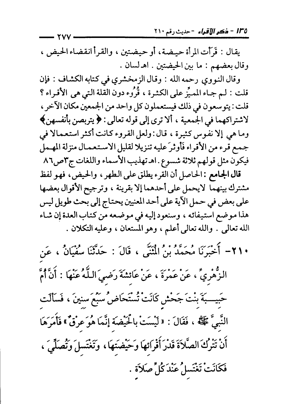 210 - أَخْبَرَنَا مُحَمَّدُ بْنُ الْمُثَنَّى، قَالَ: حَدَّثَنَا سُفْيَانُ، عَنِ الزُّهْرِيِّ، عَنْ عَمْرَةَ، عَنْ عَائِشَةَ رَضِيَ اللهُ عَنْهَا: أَنَّ أُمَّ حَبِيبَةَ بِنْتَ جَحْشٍ كَانَتْ تُسْتَحَاضُ سَبْعَ سِنِينَ، فَسَأَلَتِ النَّبِيَّ - صلى الله عليه وسلم -، فَقَالَ: "لَيْسَتْ بِالْحَيْضَةِ إِنَّمَا هُوَ عِرْقٌ" فَأَمَرَهَا أَنْ تَتْرُكَ الصَّلاَةَ قَدْرَ أَقْرَائِهَا وَحَيْضَتِهَا، وَتَغْتَسِلَ وَتُصَلِّيَ، فَكَانَتْ تَغْتَسِلُ عِنْدَ كُلِّ صَلاَةٍ.