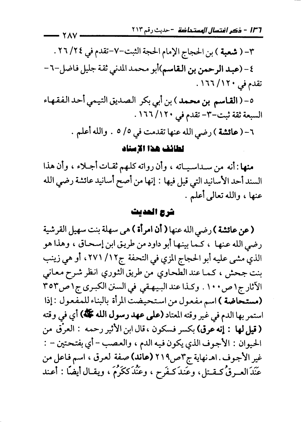 (عن عائشة) رضي الله عنها (أن امرأة) هى سهلة بنت سهيل القرشية رضي الله عنها، كما بينها أبو داود من طريق ابن إسحاق، وهذا هو الذي مشى عليه أبو الحجاج المزي في التحفة ج 12/ 271، أو هي زينب بنت جحش، كما عند الطحاوي من طريق الثوري انظر شرح معاني الآثار ج 1 ص 100. وكذا عند البيهقي في السنن الكبرى ج 1 ص 353 (مستحاضة) اسم مفعول من استحيضت المرأة بالبناء للمفعول: إذا استمر بها الدم في غير وقته المعتاد (على عهد رسول الله - صلى الله عليه وسلم -) أي في وقته (قيل لها: إنه عرق) بكسر فسكون، قال ابن الأثير رحمه: العرْق من الحيوان: الأجوف الذي يكون فيه الدم، والعصب -أي بفتحتين-: غير الأجوف. اهـ نهاية ج 3 ص 219 (عاند) صفة لعرق، اسم فاعل من عَنَدَ العرقُ كقتل، وعَندَ كفَرح، وعَنُدَ ككَرُمَ، ويقال أيضًا: أعند