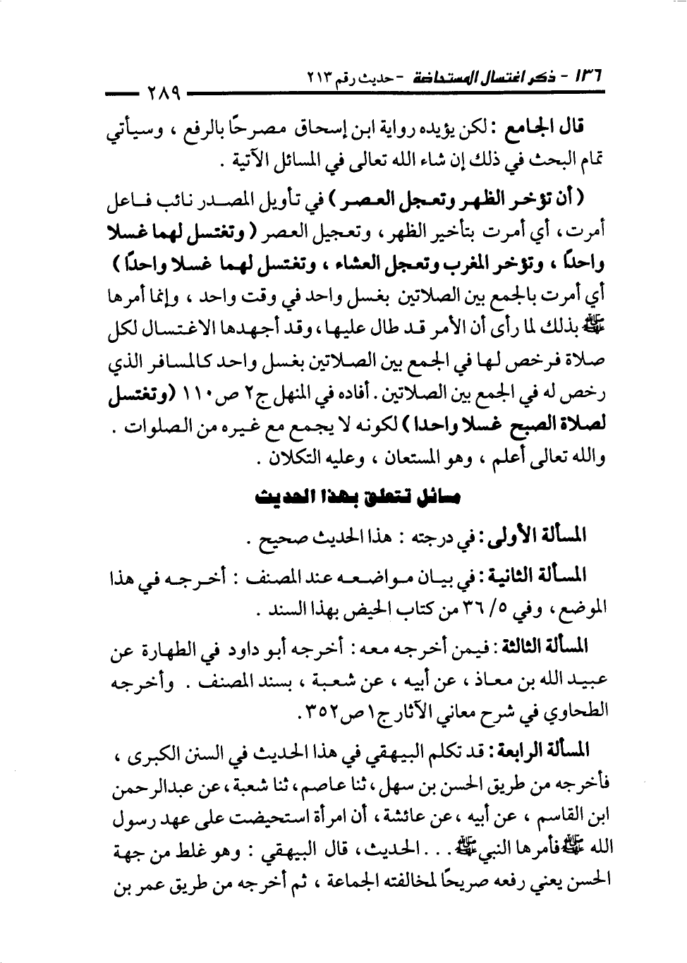 المسألة الرابعة: قد تكلم البيهقي في هذا الحديث في السنن الكبرى، فأخرجه من طريق الحسن بن سهل، ثنا عاصم، ثنا شعبة، عن عبد الرحمن ابن القاسم، عن أبيه، عن عائشة، أن امرأة استحيضت على عهد رسول الله - صلى الله عليه وسلم - فأمرها النبي - صلى الله عليه وسلم - ... الحديث، قال البيهقي: وهو غلط من جهة الحسن يعني رفعه صريحًا لمخالفته الجماعة، ثم أخرجه من طريق عمر بن