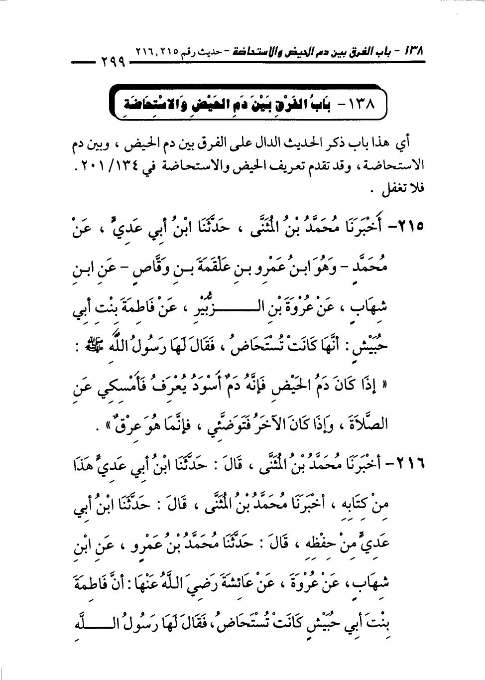 216 - أَخْبَرَنَا مُحَمَّدُ بْنُ الْمُثَنَّى، قَالَ: حَدَّثَنَا ابْنُ أَبِي عَدِيٍّ هَذَا مِنْ كِتَابِهِ، أَخْبَرَنَا مُحَمَّدُ بْنُ الْمُثَنَّى، قَالَ: حَدَّثَنَا ابْنُ أَبِي عَدِيٍّ مِنْ حِفْظِهِ، قَالَ: حَدَّثَنَا مُحَمَّدُ بْنُ عَمْرٍو، عَنِ ابْنِ شِهَابٍ، عَنْ عُرْوَةَ، عَنْ عَائِشَةَ - رَضِيَ اللهُ عَنْهَا: أَنَّ فَاطِمَةَ بِنْتَ أَبِي حُبَيْشٍ كَانَتْ تُسْتَحَاضُ، فَقَالَ لَهَا رَسُولُ اللهِ