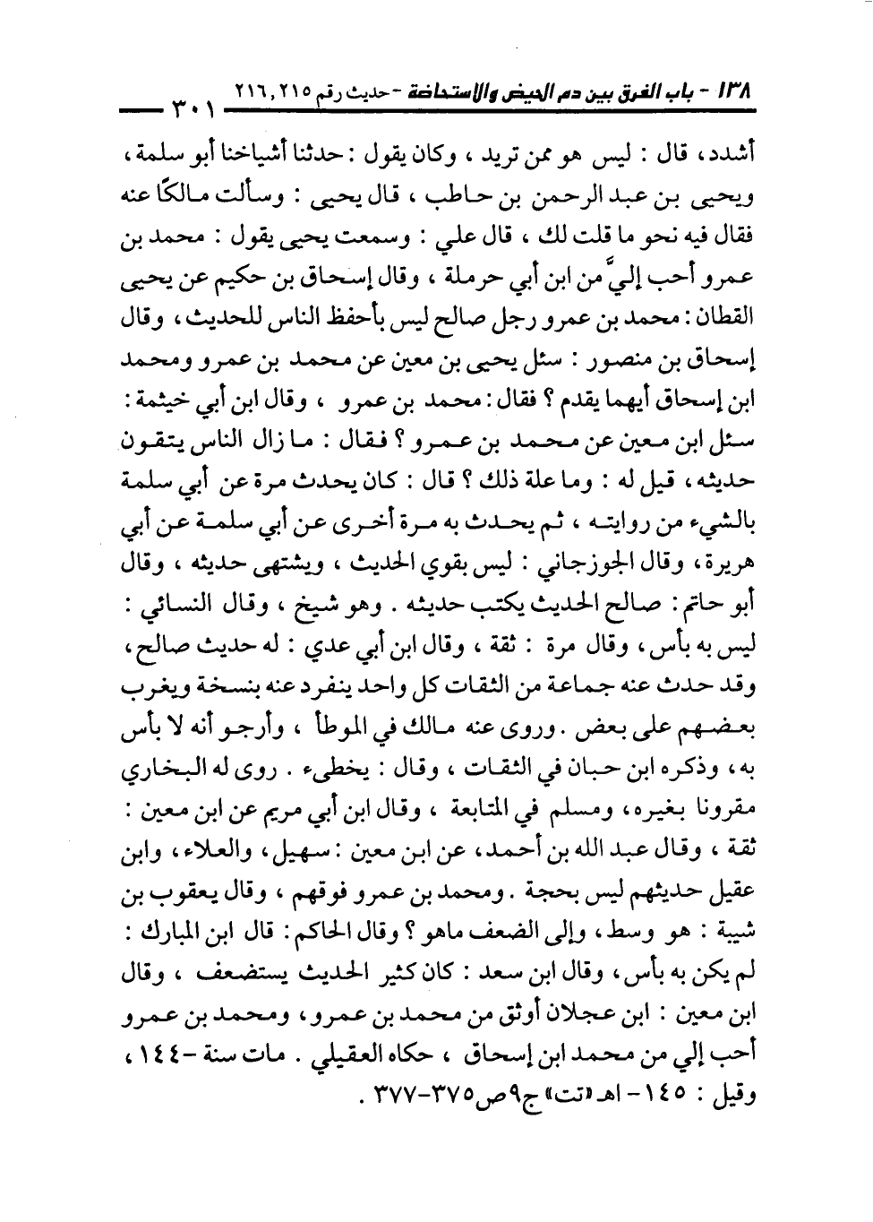 أشدد، قال: ليس هو ممن تريد، وكان يقول: حدثنا أشياخنا أبو سلمة، ويحيى بن عبد الرحمن بن حاطب، قال يحيى: وسألت مالكًا عنه فقال فيه نحو ما قلت لك، قال علي: وسمعت يحيى يقول: محمَّد بن عمرو أحب إليَّ من ابن أبي حرملة، وقال إسحاق بن حكيم عن يحيى القطان: محمَّد بن عمرو رجل صالح ليس بأحفظ الناس للحديث، وقال إسحاق بن منصور: سئل يحيى بن معين عن محمَّد بن عمرو ومحمد ابن إسحاق أيهما يقدم؟ فقال: محمَّد بن عمرو، وقال ابن أبي خيثمة: سئل ابن معين عن محمَّد بن عمرو؟ فقال: ما زال الناس يتقون حديثه، قيل له: وما علة ذلك؟ قال: كان يحدث مرة عن أبي سلمة بالشيء من روايته، ثم يحدث به مرة أخرى عن أبي سلمة عن أبي هريرة، وقال الجوزجاني: ليس بقوي الحديث، ويشتهى حديثه، وقال أبو حاتم: صالح الحديث يكتب حديثه. وهو شيخ، وقال النسائي: ليس به بأس، وقال مرة: ثقة، وقال ابن أبي عدي: له حديث صالح، وقد حدث عنه جماعة من الثقات كل واحد ينفرد عنه بنسخة ويغرب بعضهم على بعض. وروى عنه مالك في الموطأ، وأرجو أنه لا بأس به، وذكره ابن حبان في الثقات، وقال: يخطئ. روى له البخاري مقرونا بغيره، ومسلم في المتابعة، وقال ابن أبي مريم عن ابن معين: ثقة، وقال عبد الله بن أحمد، عن ابن معين: سهيل، والعلاء، وابن عقيل حديثهم ليس بحجة. ومحمد بن عمرو فوقهم، وقال يعقوب بن شيبة: هو وسط، وإلى الضعف ما هو؟ وقال الحاكم: قال ابن المبارك: لم يكن به بأس، وقال ابن سعد: كان كثير الحديث يستضعف، وقال ابن معين: ابن عجلان أوثق من محمَّد بن عمرو، ومحمد بن عمرو أحب إلى من محمَّد ابن إسحاق، حكاه العقيلي. مات سنة-144، وقيل: 145 - اهـ "تت" ج 9 ص 375 - 377.
