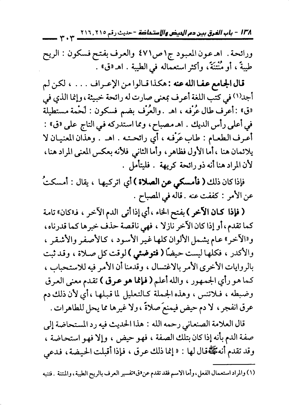 قال العلامة الصنعاني رحمه الله: هذا الحديث فيه رد المستحاضة إلى صفة الدم بأنه إذا كان بتلك الصفة، فهو حيض، وإلا فهو استحاضة، وقد تقدم أنه - صلى الله عليه وسلم - قال لها: "إنما ذلك عرق، فإذا أقبلت الحيضة، فدعي