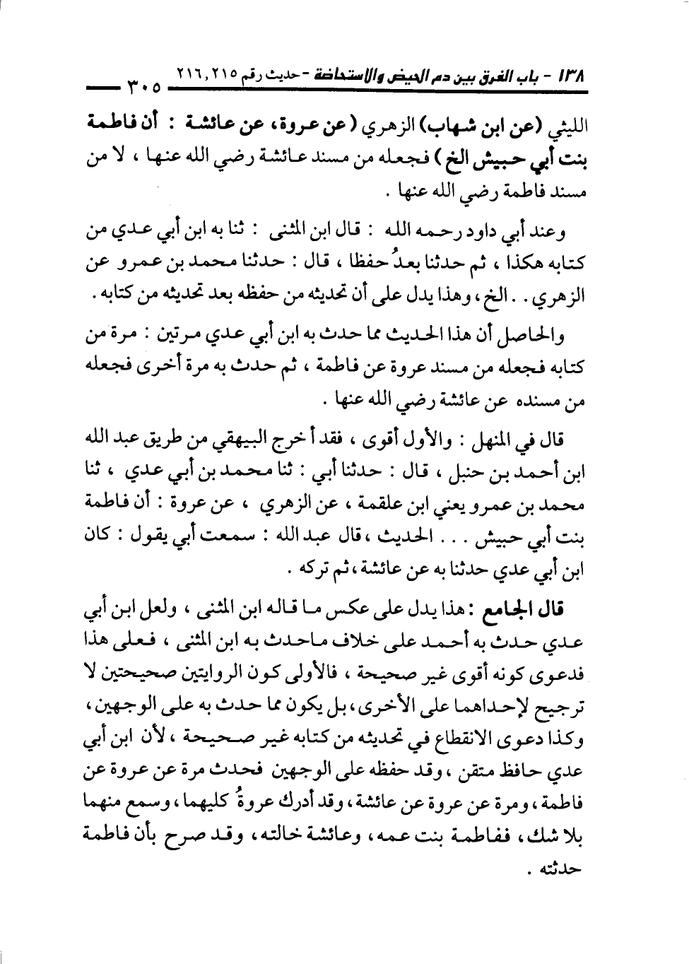 قال الجامع: هذا يدل على عكس ما قاله ابن المثنى، ولعل ابن أبي عدي حدث به أحمد على خلاف ما حدث به ابن المثنى، فعلى هذا فدعوى كونه أقوى غير صحيحة، فالأولى كون الروايتين صحيحتين لا ترجيح لإحداهما على الأخرى، بل يكون مما حدث به على الوجهين، وكذا دعوى الانقطاع في تحديثه من كتابه غير صحيحة؛ لأن ابن أبي عدي حافظ متقن، وقد حفظه على الوجهين فحدث مرة عن عروة عن فاطمة، ومرة عن عروة عن عائشة، وقد أدرك عروةُ كليهما، وسمع منهما بلا شك، ففاطمة بنت عمه، وعائشة خالته، وقد صرح بأن فاطمة حدثته.
