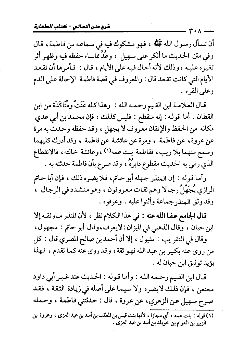 قال ابن القيم رحمه الله: وأما قوله: الحديث عند غير أبي داود معنعن، فإن ذلك لا يضره ولا سيما على أصله في زيادة الثقة، فقد صرح سهيل عن الزهري، عن عروة، قال: حدثتني فاطمة، وحمله