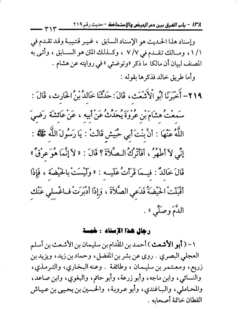 219 - أَخْبَرَنَا أَبُو الأَشْعَثِ، قَالَ: حَدَّثَنَا خَالِدُ بْنُ الْحَارِثِ، قَالَ: سَمِعْتُ هِشَامَ بْنَ عُرْوَةَ يُحَدِثُ عَنْ أَبِيهِ، عَنْ عَائِشَةَ - رَضِيَ اللهُ عَنْهَا: أَنَّ بِنْتَ أَبِي حُبَيْشٍ قَالَتْ: يَا رَسُولَ اللهِ إِنِّي لاَ أَطْهُرُ، أَفَأَتْرُكُ الصَّلاَةَ؟ قَالَ: "لاَ إِنَّمَا هُوَ عِرْقٌ". قَالَ خَالِدٌ: فِيمَا قَرَأْتُ عَلَيْهِ: "وَلَيْسَتْ بِالْحَيْضَةِ، فَإِذَا أَقْبَلَتِ الْحَيْضَةُ فَدَعِي الصَّلاَةَ، وَإِذَا أَدْبَرَتْ فَاغْسِلِي عَنْكِ الدَّمَ وَصَلِّي".