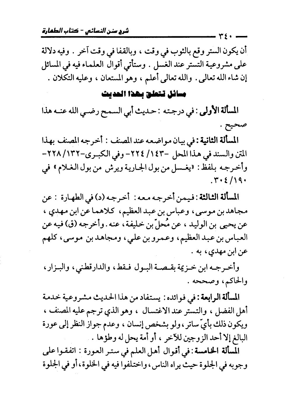 المسألة الثانية: في بيان مواضعه عند المصنف: أخرجه المصنف بهذا المتن والسند في هذا المحل -143/ 224 - وفي الكبرى -132/ 228 - وأخرجه بلفظ: "يغسل من بول الجارية ويرش من بول الغلام" في 190/ 304.