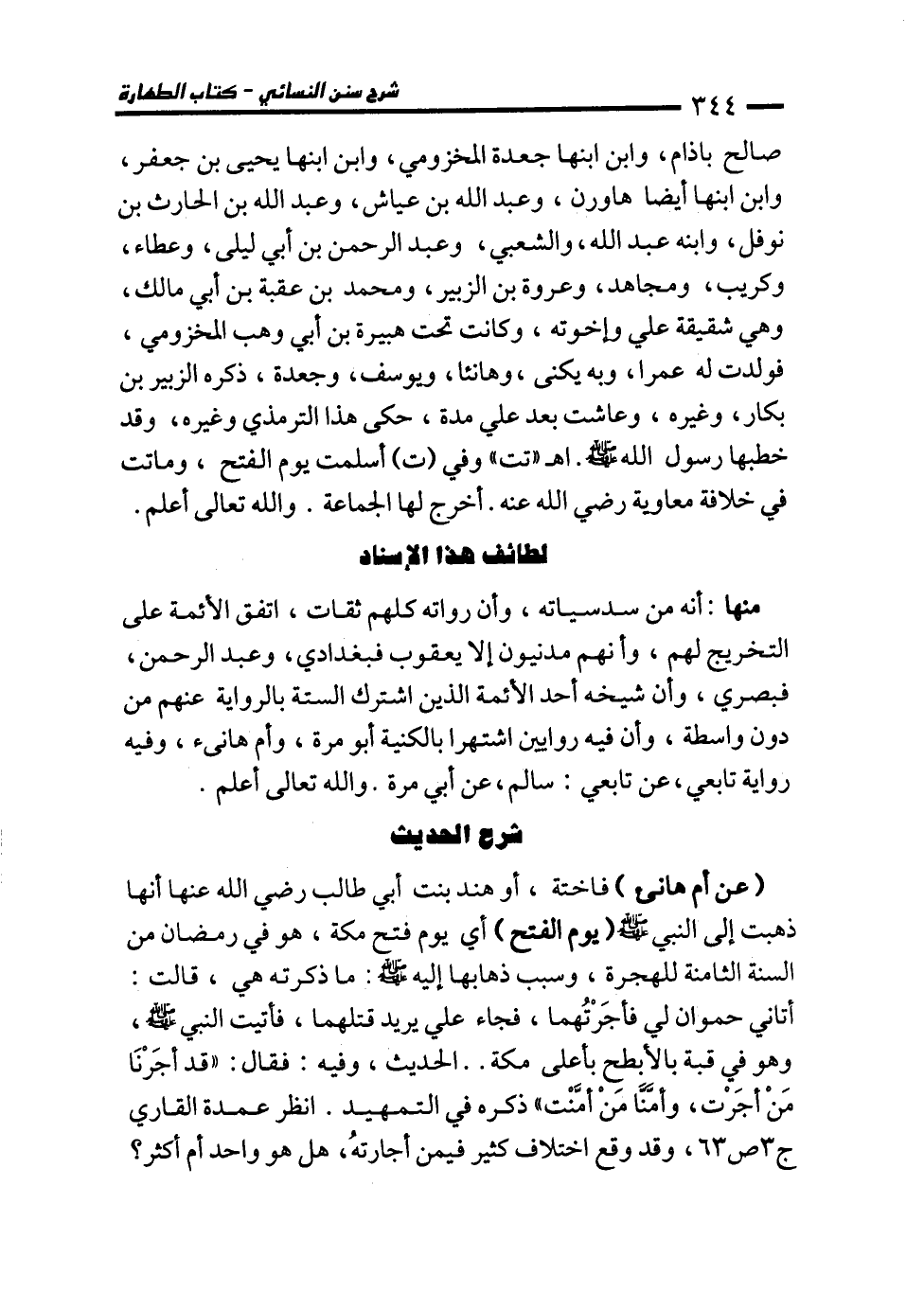 منها: أنه من سدسياته، وأن رواته كلهم ثقات، اتفق الأئمة على التخريج لهم، وأنهم مدنيون إلا يعقوب فبغدادي، وعبد الرحمن، فبصري، وأن شيخه أحد الأئمة الذين اشترك الستة بالرواية عنهم من دون واسطة، وأن فيه روايين اشتهرا بالكنية أبو مرة، وأم هانىء، وفيه رواية تابعي، عن تابعي: سالم، عن أبي مرة. والله تعالى أعلم.