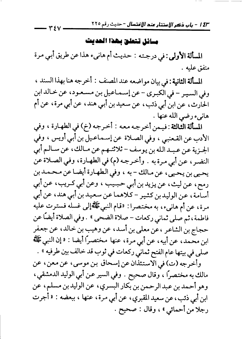 المسألة الأولى: في درجته: حديث أم هانئ هذا عن طريق أبي مرة متفق عليه.