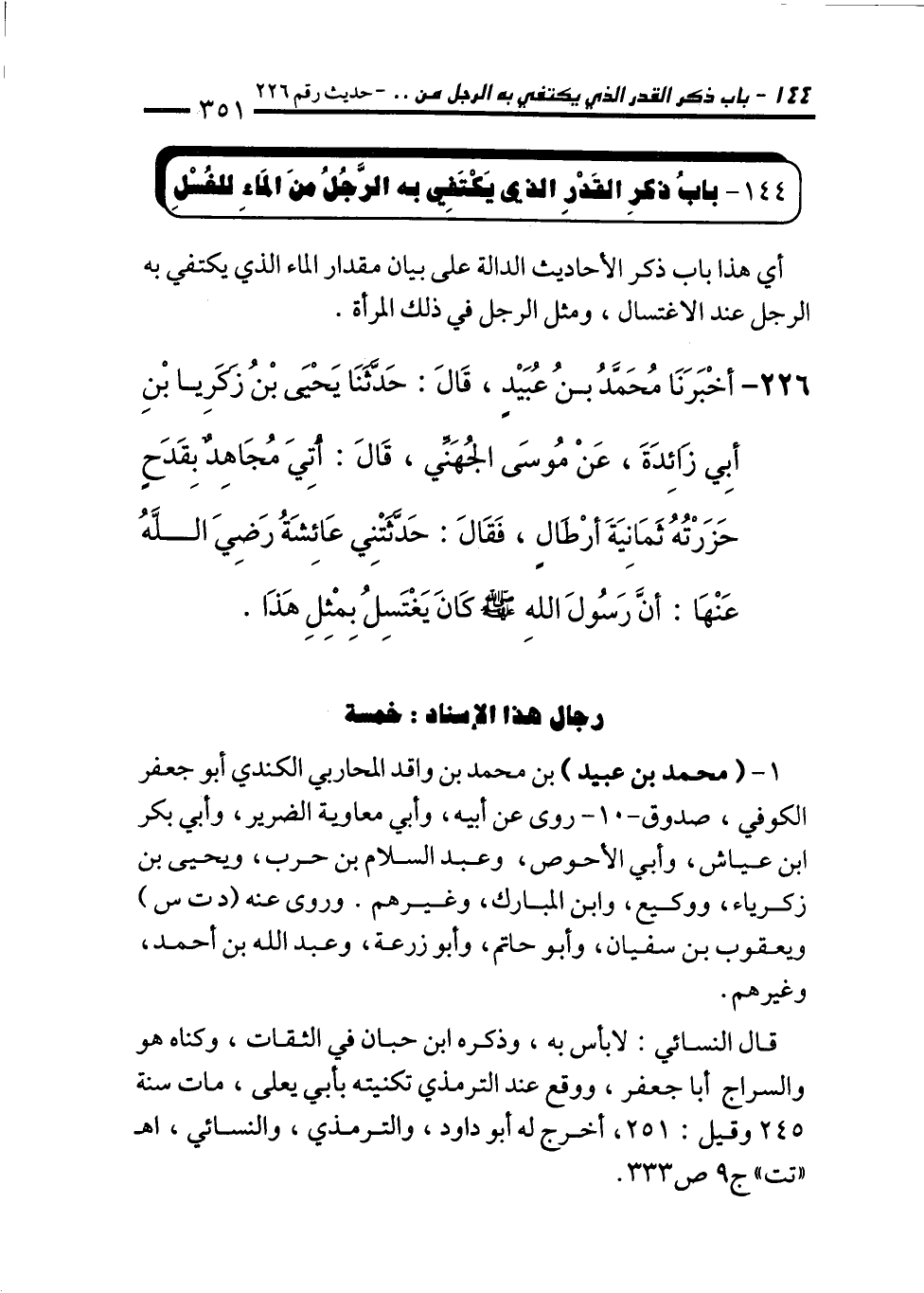 226 - أَخْبَرَنَا مُحَمَّدُ بْنُ عُبَيْدٍ، قَالَ: حَدَّثَنَا يَحْيَى بْنُ زَكَرِيَّا بْنِ أَبِي زَائِدَةَ، عَنْ مُوسَى الْجُهَنِيِّ، قَالَ: أُتِيَ مُجَاهِدٌ بِقَدَحٍ حَزَرْتُهُ ثَمَانِيَةَ أَرْطَالٍ، فَقَالَ: حَدَّثَتْنِي عَائِشَةُ رَضِيَ اللهُ عَنْهَا: أَنَّ رَسُولَ اللهِ - صلى الله عليه وسلم - كَانَ يَغْتَسِلُ بِمِثْلِ هَذَا.