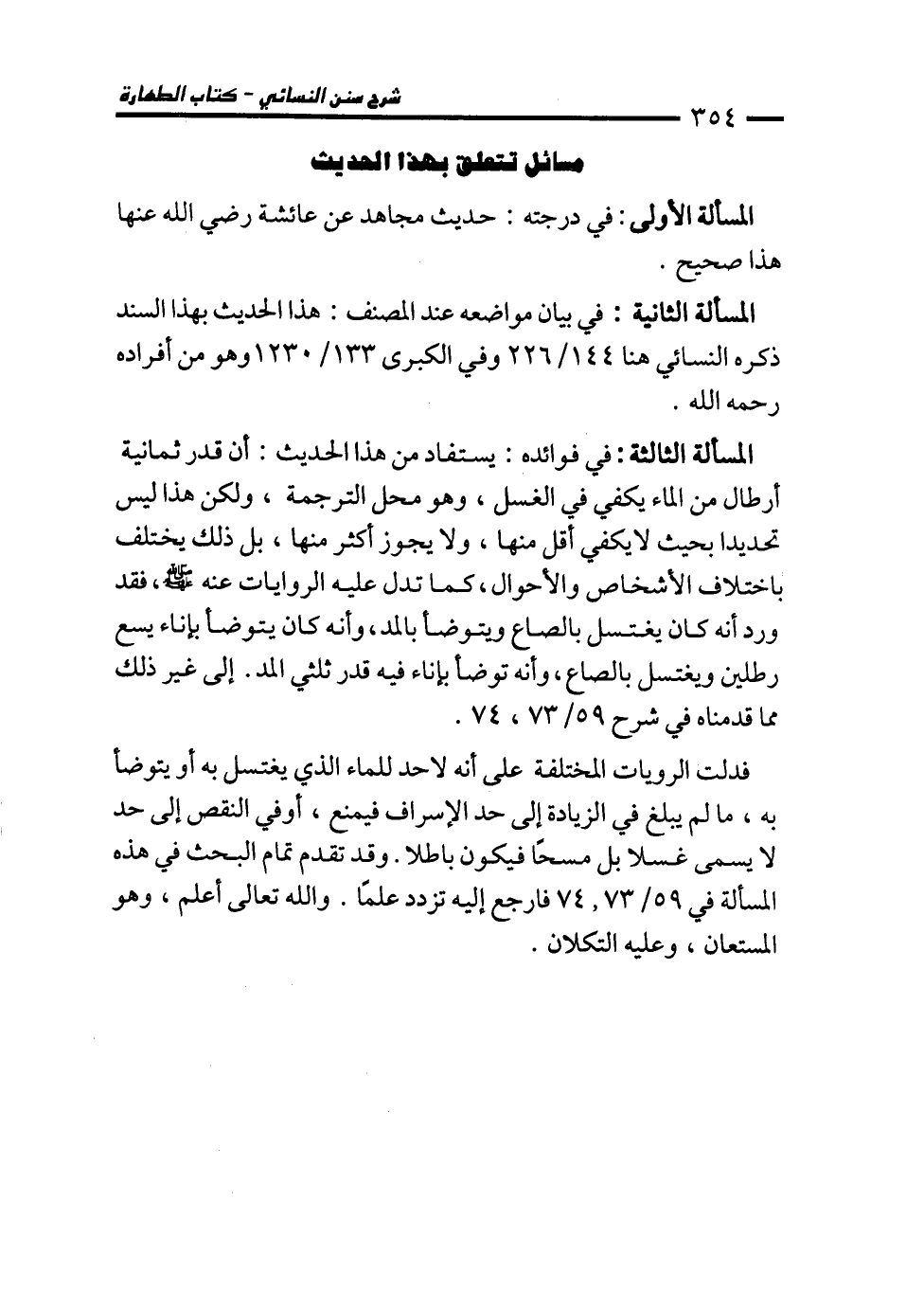 فدلت الرويات المختلفة على أنه لاحد للماء الذي يغتسل به أو يتوضأ به، ما لم يبلغ في الزيادة إلى حد الإسراف فيمنع، أو في النقص إلى حد لا يسمى غسلا بل مسحًا فيكون باطلا. وقد تقدم تمام البحث في هذه المسألة في 59/ 73، 74 فارجع إليه تزدد علمًا. والله تعالى أعلم، وهو المستعان، وعليه التكلان.