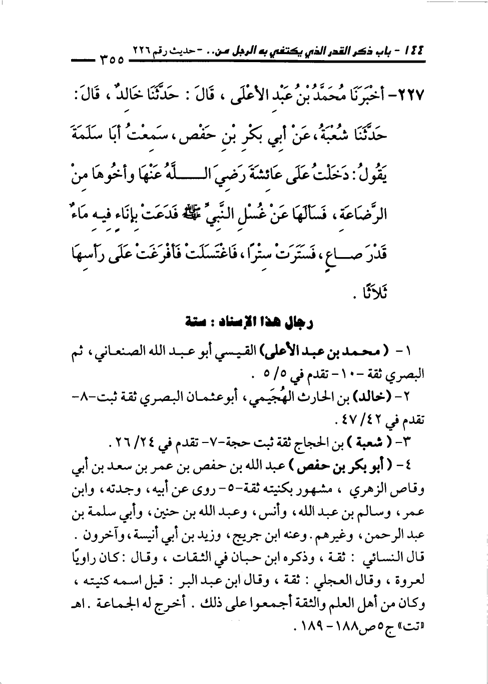 227 - أَخْبَرَنَا مُحَمَّدُ بْنُ عَبْدِ الأَعْلَى، قَالَ: حَدَّثَنَا خَالِدٌ، قَالَ: حَدَّثَنَا شُعْبَةُ، عَنْ أَبِي بَكْرِ بْنِ حَفْصٍ، سَمِعْتُ أَبَا سَلَمَةَ يَقُولُ: دَخَلْتُ عَلَى عَائِشَةَ رَضِيَ اللهُ عَنْهَا وَأَخُوهَا مِنَ الرَّضَاعَةِ، فَسَأَلَهَا عَنْ غُسْلِ النَّبِيِّ - صلى الله عليه وسلم - فَدَعَتْ بِإِنَاءٍ فِيهِ مَاءٌ قَدْرَ صَاعٍ، فَسَتَرَتْ سِتْرًا، فَاغْتَسَلَتْ فَأَفْرَغَتْ عَلَى رَأْسِهَا ثَلاَثًا.
