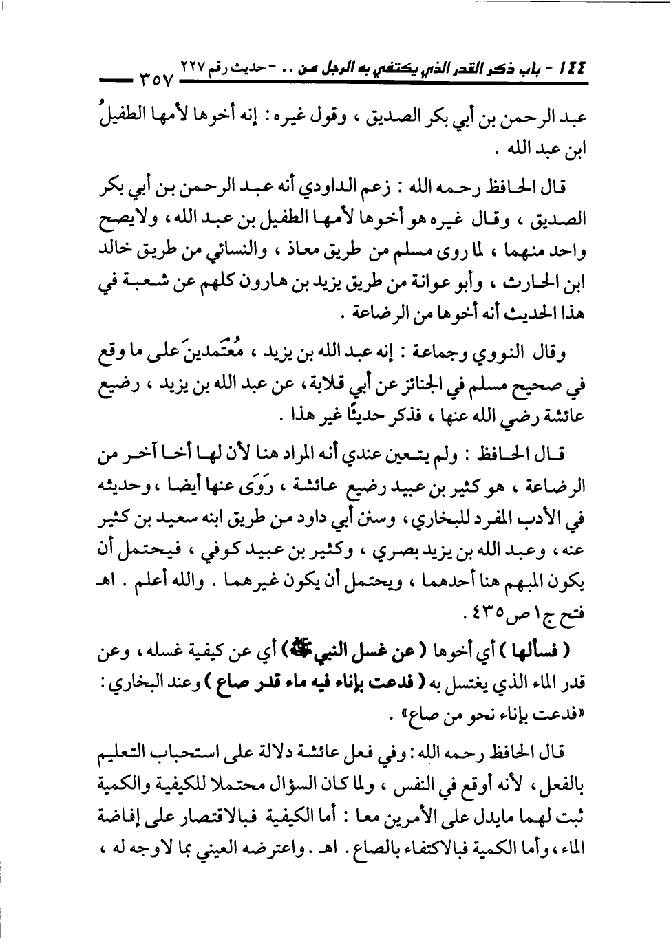 قال الحافظ رحمه الله: وفي فعل عائشة دلالة على استحباب التعليم بالفعل, لأنه أوقع في النفس، ولما كان السؤال محتملا للكيفية والكمية ثبت لهما ما يدل على الأمرين معا: أما الكيفية فبالاقتصار على إفاضة الماء، وأما الكمية فبالاكتفاء بالصاع. اهـ. واعترضه العيني بما لا وجه له،
