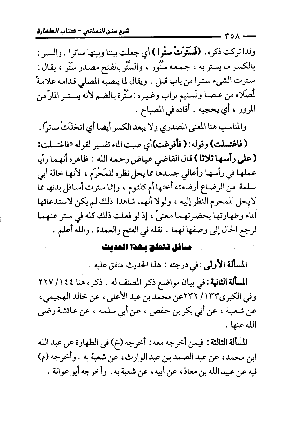 المسألة الثانية: في بيان مواضع ذكر المصنف له. ذكره هنا 144/ 227 وفي الكبرى 133/ 232 عن محمَّد بن عبد الأعلى، عن خالد الهجيمي، عن شعبة، عن أبي بكر بن حفص، عن أبي سلمة، عن عائشة رضي الله عنها.