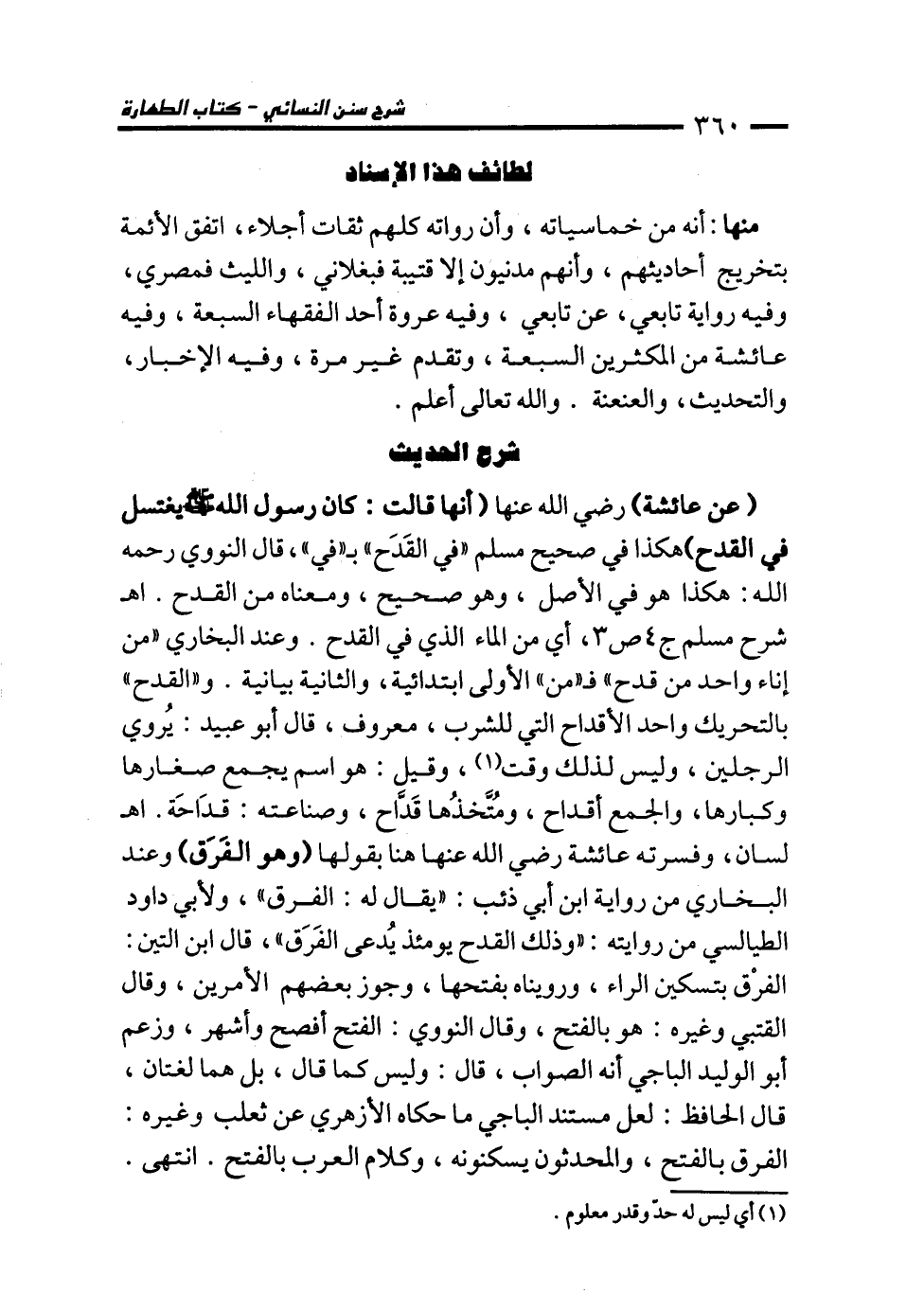 (عن عائشة) رضي الله عنها (أنها قالت: كان رسول الله - صلى الله عليه وسلم - يغتسل في القدح) هكذا في صحيح مسلم "في القَدَح" بـ"في"، قال النووي رحمه الله: هكذا هو في الأصل، وهو صحيح، ومعناه من القدح. اهـ شرح مسلم ج 4 ص 3، أي من الماء الذي في القدح. وعند البخاري "من إناء واحد من قدح" فـ"من" الأولى ابتدائية، والثانية بيانية. و"القدح" بالتحريك واحد الأقداح التي للشرب، معروف، قال أبو عبيد: يُروي الرجلين، وليس لذلك وقت (¬1)، وقيل: هو اسم يجمع صغارها وكبارها، والجمع أقداح، ومُتَّخذُها قَدَّاح، وصناعته: قدَاحَة. اهـ لسان، وفسرته عائشة رضي الله عنها هنا بنولها (وهو الفَرَق) وعند البخاري من رواية ابن أبي ذئب: "يقال له: الفرق"، ولأبي داود الطيالسي من روايته: "وذلك القدح يومئذ يُدعى الفَرَق"، قال ابن التين: الفرْق بتسكين الراء، ورويناه بفتحها، وجوز بعضهم الأمرين، وقال القتبي وغيره: هو بالفتح، وقال النووي: الفتح أفصح وأشهر، وزعم أبو الوليد الباجي أنه الصواب، قال: وليس كما قال، بل هما لغتان، قال الحافظ: لعل مستند الباجي ما حكاه الأزهري عن ثعلب وغيره: الفرق بالفتح، والمحدثون يسكنونه، وكلام العرب بالفتح. انتهى.