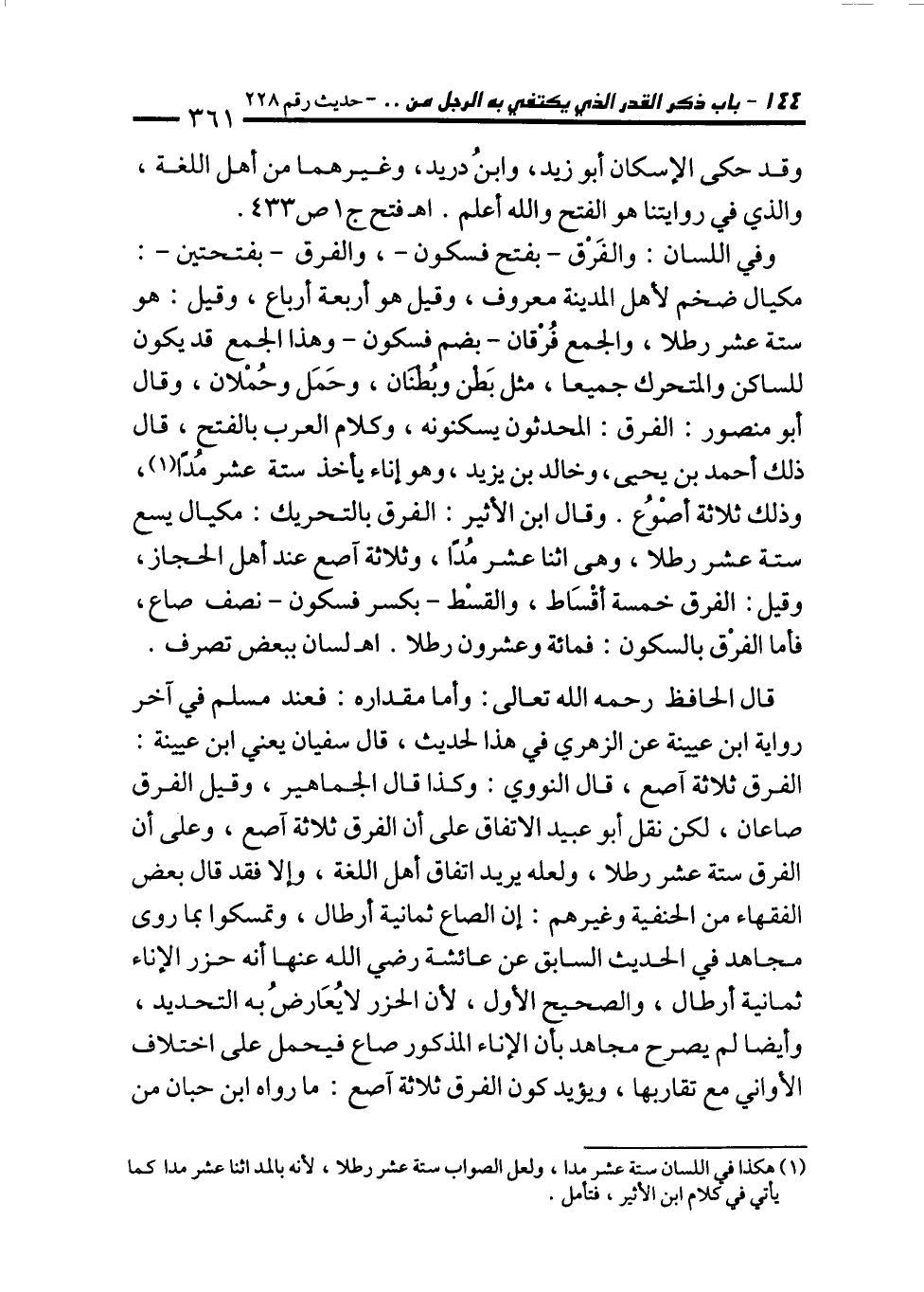 قال الحافظ رحمه الله تعالى: وأما مقداره: فعند مسلم في آخر رواية ابن عيينة عن الزهري في هذا لحديث، قال سفيان يعني ابن عيينة: الفرق ثلاثة آصع، قال النووي: وكذا قال الجماهير، وقيل الفرق صاعان، لكن نقل أبو عبيد الاتفاق على أن الفرق ثلاثة آصع، وعلى أن الفرق ستة عشر رطلا، ولعله يريد اتفاق أهل اللغة، وإلا فقد قال بعض الفقهاء من الحنفية وغيرهم: إن الصاع ثمانية أرطال، وتمسكوا بما روى مجاهد في الحديث السابق عن عائشة رضي الله عنها أنه حزر الإناء ثمانية أرطال، والصحيح الأول؛ لأن الحزر لا يُعَارضُ به التحديد، وأيضا لم يصرح مجاهد بأن الإناء المذكور صاع فيحمل على اختلاف الأواني مع تقاربها، ويؤيد كون الفرق ثلاثة آصع: ما رواه ابن حبان من