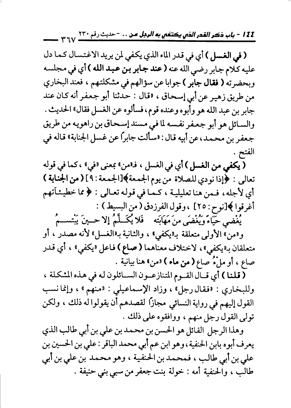 و"من" الأولى متعلقة بـ "يكفي"، والثانية بـ "الغسل" لأنه مصدر، أو متعلقان بـ"يكفي"، لاختلاف معناهما (صاع) فاعل "يكفي"، أي قدر صاع، أو ملْءُ صاع (من ماء) "من" هنا بيانية.