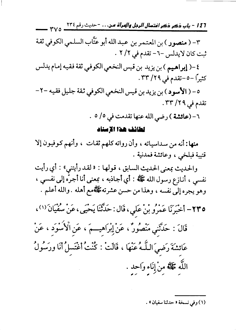 235 - أَخْبَرَنَا عَمْرُو بْنُ عَلِيٍّ، قَالَ: حَدَّثَنَا يَحْيَى، عَنْ سُفْيَانُ (¬1)، قَالَ: حَدَّثَنِي مَنْصُورٌ، عَنْ إِبْرَاهِيمَ، عَنِ الأَسْوَدِ، عَنْ عَائِشَةَ رَضِيَ اللهُ عَنْهَا، قَالَتْ: كُنْتُ أَغْتَسِلُ أَنَا وَرَسُولُ اللهِ - صلى الله عليه وسلم - مِنْ إِنَاءٍ وَاحِدٍ.