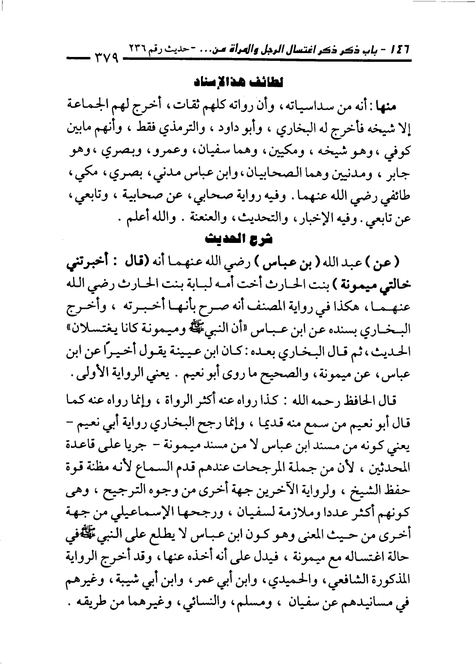قال الحافظ رحمه الله: كذا رواه عنه أكثر الرواة، وإنما رواه عنه كما قال أبو نعيم من سمع منه قديما، وإنما رجح البخاري رواية أبي نعيم -يعني كونه من مسند ابن عباس لا من مسند ميمونة- جريا على قاعدة المحدثين؛ لأن من جملة المرجحات عندهم قدم السماع لأنه مظنة قوة حفظ الشيخ، ولرواية الآخرين جهة أخرى من وجوه الترجيح، وهي كونهم أكثر عددا وملازمة لسفيان، ورجحها الإسماعيلي من جهة أخرى من حيث المعنى وهو كون ابن عباس لا يطلع على النبي - صلى الله عليه وسلم - في حالة اغتساله مع ميمونة، فيدل على أنه أخذه عنها، وقد أخرج الرواية المذكورة الشافعي، والحميدي، وابن أبي عمر، وابن أبي شيبة، وغيرهم في مسانيدهم عن سفيان، ومسلم، والنسائي، وغيرهما من طريقه.