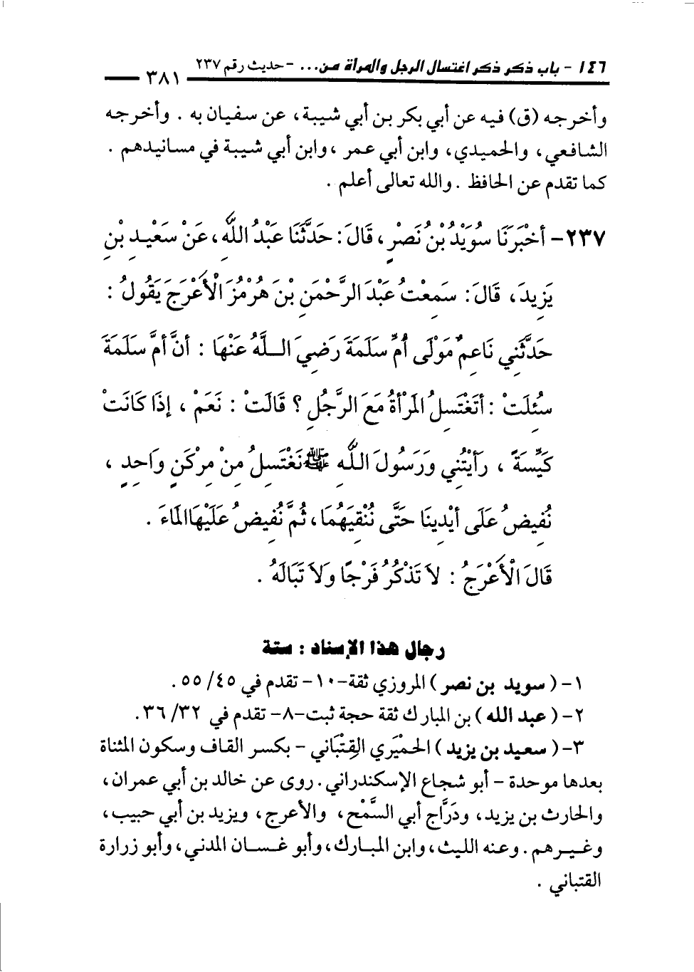 237 - أَخْبَرَنَا سُوَيْدُ بْنُ نَصْرٍ، قَالَ: حَدَّثَنَا عَبْدُ اللهِ، عَنْ سَعِيدِ بْنِ يَزِيدَ، قَالَ: سَمِعْتُ عَبْدَ الرَّحْمَنِ بْنَ هُرْمُزَ الأَعْرَجَ يَقُولُ: حَدَّثَنِي نَاعِمٌ مَوْلَى أُمِّ سَلَمَةَ رَضِيَ اللهُ عَنْهَا: أَنَّ أُمَّ سَلَمَةَ سُئِلَتْ: أَتَغْتَسِلُ الْمَرْأَةُ مَعَ الرَّجُلِ؟ قَالَتْ: نَعَمْ، إِذَا كَانَتْ كَيِّسَةً، رَأَيْتُنِي وَرَسُولَ اللهِ - صلى الله عليه وسلم - نَغْتَسِلُ مِنْ مِرْكَنٍ وَاحِدٍ، نُفِيضُ عَلَى أَيْدِينَا حَتَّى نُنْقِيَهُمَا، ثُمَّ نُفِيضَ عَلَيْهَا الْمَاءَ.