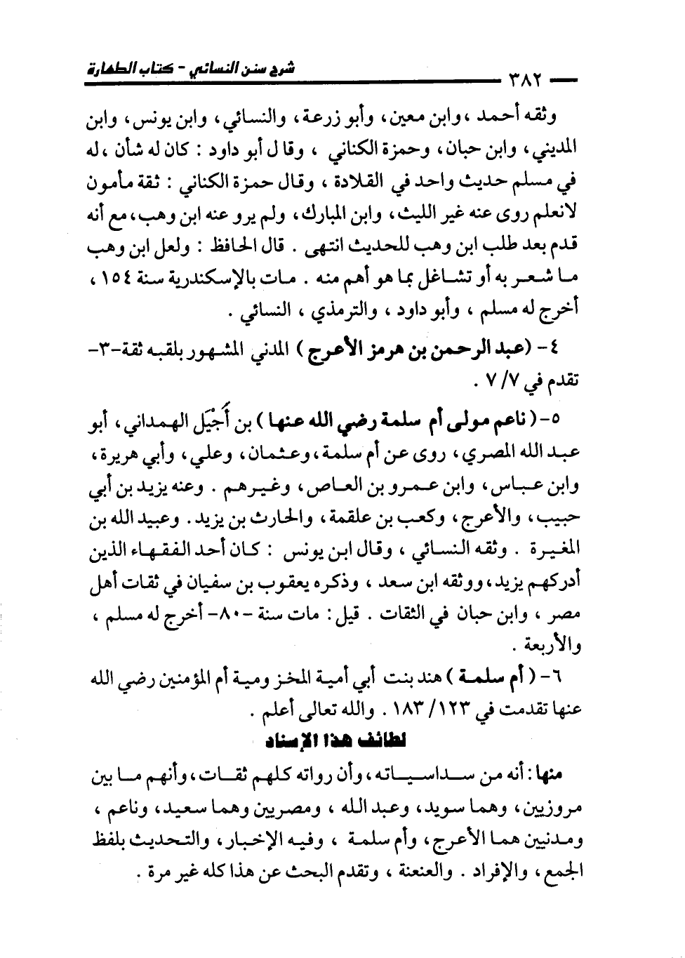 منها: أنه من سداسياته، وأن رواته كلهم ثقات، وأنهم ما بين مروزين، وهما سويد، وعبد الله، ومصريين وهما سعيد، وناعم، ومدنيين هما الأعرج، وأم سلمة، وفيه الإخبار، والتحديث بلفظ الجمع، والإفراد. والعنعنة، وتقدم البحث عن هذا كله غير مرة.