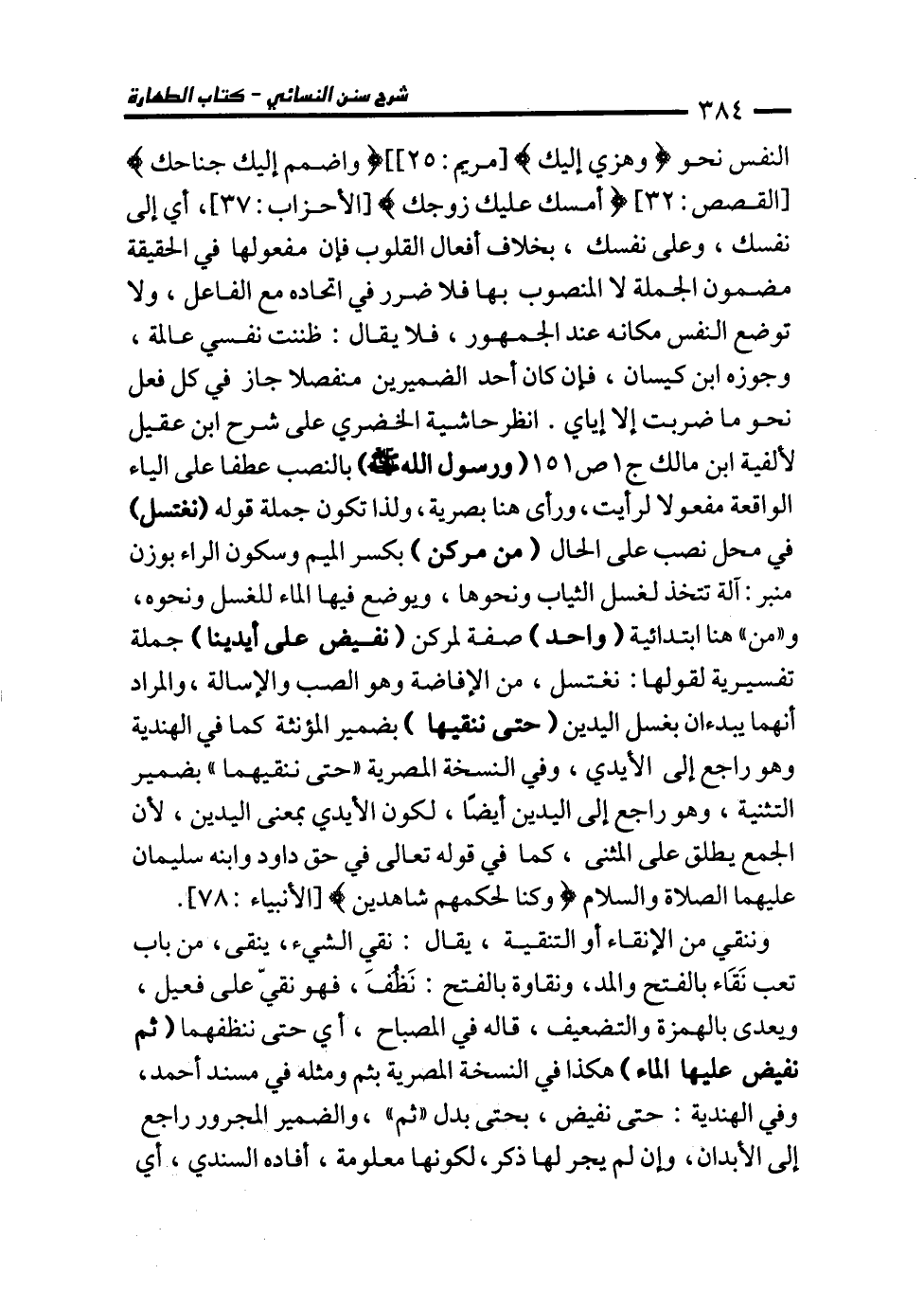 توضع النفس مكانه عند الجمهور، فلا يقال: ظننت نفسي عالمة، وجوزه ابن كيسان، فإن كان أحد الضميرين منفصلا جاز في كل فعل نحو ما ضربت إلا إياي. انظر حاشية الخضري على شرح ابن عقيل لألفية ابن مالك ج 1 ص 151 (ورسول الله - صلى الله عليه وسلم -) بالنصب عطفا على الياء الواقعة مفعولا لرأيت، ورأى هنا بصرية، ولذا تكون جملة قوله (نغتسل)