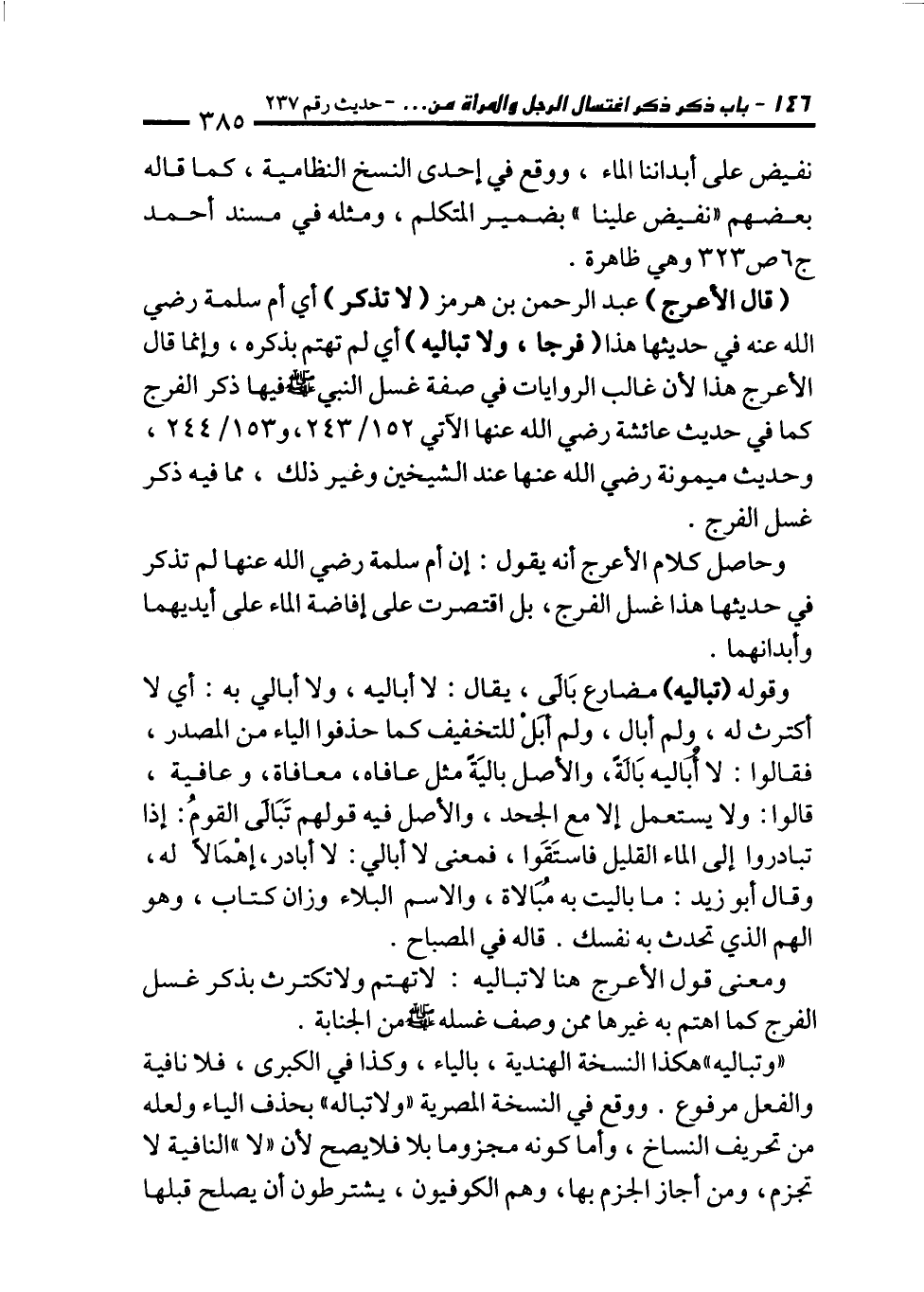 (قال الأعرج) عبد الرحمن بن هرمز (لا تذكر) أي أم سلمة رضي الله عنه في حديثها هذا (فرجا، ولا تباليه) أي لم تهتم بذكره، وإنما قال الأعرج هذا لأن غالب الروايات في صفة غسل النبي - صلى الله عليه وسلم - فيها ذكر الفرج كما في حديث عائشة رضي الله عنها الآتي 152/ 243، و 153/ 244، وحديث ميمونة رضي الله عنها عند الشيخين وغير ذلك، مما فيه ذكر غسل الفرج.