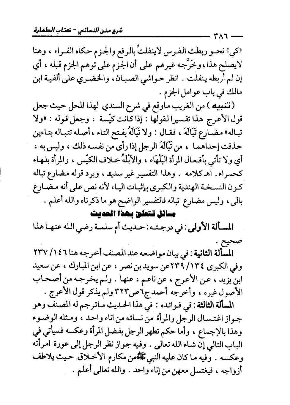 المسألة الثانية: في بيان مواضعه عند المصنف أخرجه هنا 146/ 237 وفي الكبرى 134/ 239 عن سويد بن نصر، عن ابن المبارك، عن سعيد ابن يزيد، عن الأعرج، عن ناعم، عنها. ولم يخرجه من أصحاب الأصول غيره، وأخرجه أحمد ج 6 ص 323 ولم يذكر قول الأعرج.