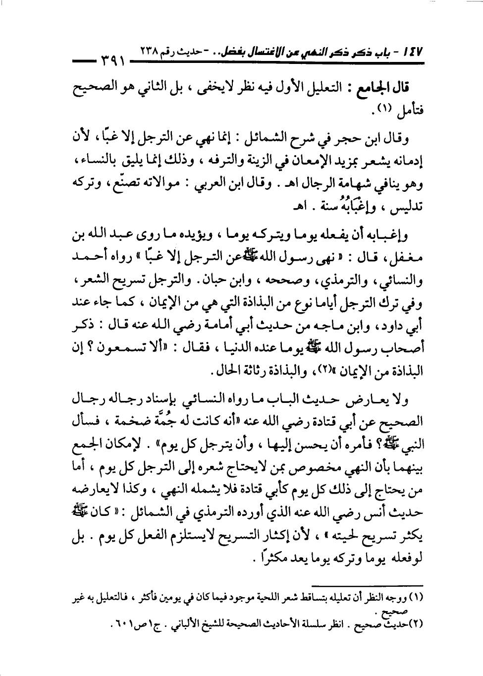ولا يعارض حديث الباب ما رواه النسائي بإسناد رجاله رجال الصحيح عن أبي قتادة رضي الله عنه "أنه كانت له جُمَّة ضخمة، فسأل النبي - صلى الله عليه وسلم -؟ فأمره أن يحسن إليها، وأن يترجل كل يوم". لإمكان الجمع بينهما بأن النهي مخصوص بمن لا يحتاج شعره إلى الترجل كل يوم، أما من يحتاج إلى ذلك كل يوم كأبي قتادة فلا يشمله النهي، وكذا لا يعارضه حديث أنس رضي الله عنه الذي أورده الترمذي في الشمائل: "كان - صلى الله عليه وسلم - يكثر تسريح لحيته"؛ لأن إكثار التسريح لا يستلزم الفعل كل يوم. بل لو فعله يوما وتركه يوما يعد مكثرًا.