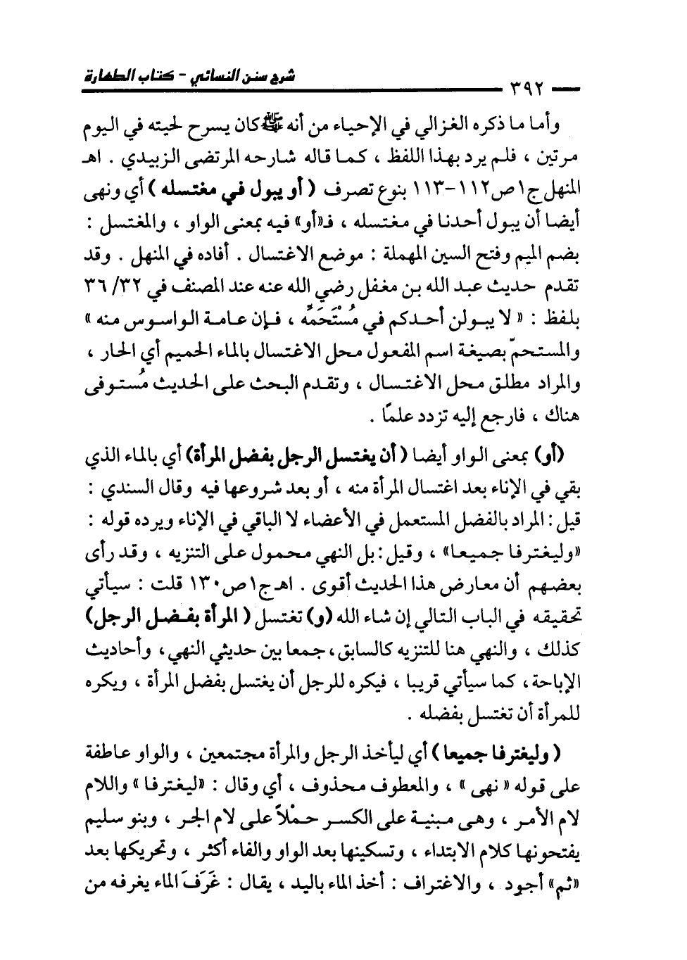 (أو) بمعنى الواو أيضا (أن يغتسل الرجل بفضل المرأة) أي بالماء الذي بقي في الإناء بعد اغتسال المرأة منه، أو بعد شروعها فيه وقال السندي: قيل: المراد بالفضل المستعمل في الأعضاء لا الباقي في الإناء ويرده قوله: "وليغترفا جميعا"، وقيل: بل النهي محمول على التنزيه، وقد رأى بعضهم أن معارض هذا الحديث أقوى. اهـ ج 1 ص 130 قلت: سيأتي تحقيقه في الباب التالي إن شاء الله (و) تغتسل (المرأة بفضل الرجل) كذلك، والنهي هنا للتنزيه كالسابق، جمعا بين حديثي النهي، وأحاديث الإباحة، كما سيأتي قريبا، فيكره للرجل أن يغتسل بفضل المرأة، ويكره للمرأة أن تغتسل بفضله.