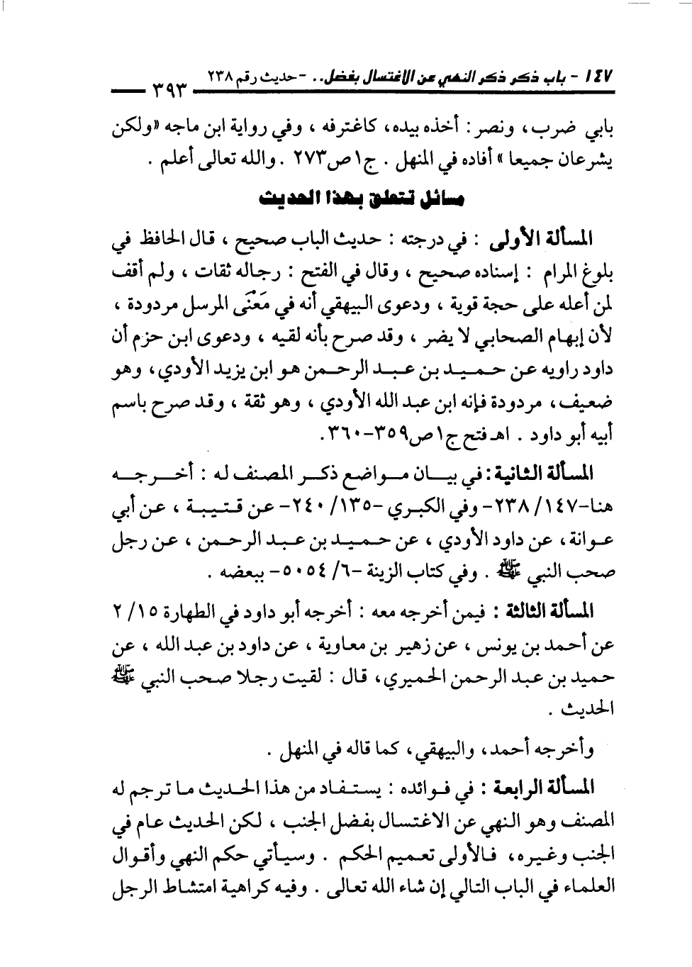المسألة الثانية: في بيان مواضع ذكر المصنف له: أخرجه هنا -147/ 238 - وفي الكبري -135/ 240 - عن قتيبة، عن أبي عوانة، عن داود الأودي، عن حميد بن عبد الرحمن، عن رجل صحب النبي - صلى الله عليه وسلم -. وفي كتاب الزينة -6/ 5054 - ببعضه.