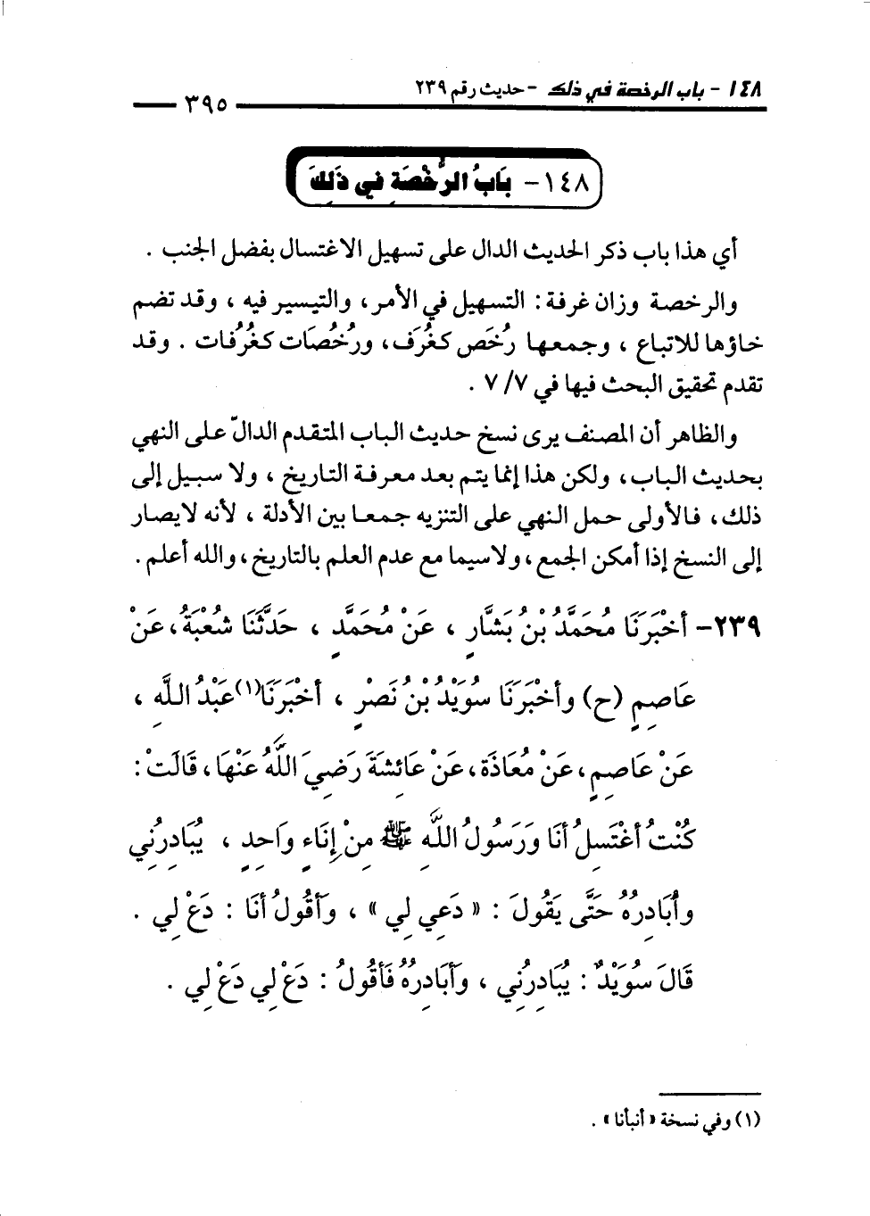 239 - أَخْبَرَنَا مُحَمَّدُ بْنُ بَشَّارٍ، عَنْ مُحَمَّدٍ، حَدَّثَنَا شُعْبَةُ، عَنْ عَاصِمٍ (ح) وَأَخْبَرَنَا سُوَيْدُ بْنُ نَصْرٍ، أَخْبَرَنَا عَبْدُ اللهِ، عَنْ عَاصِمٍ، عَنْ مُعَاذَةَ، عَنْ عَائِشَةَ رَضِيَ اللهُ عَنْهَا، قَالَتْ: كُنْتُ أَغْتَسِلُ أَنَا وَرَسُولُ اللهِ - صلى الله عليه وسلم - مِنْ إِنَاءٍ وَاحِدٍ، يُبَادِرُنِي وَأُبَادِرُهُ حَتَّى يَقُولَ: "دَعِي لِي". وَأَقُولُ أَنَا: دَعْ لِي. قَالَ سُوَيْدٌ: يُبَادِرُنِي، وَأُبَادِرُهُ فَأَقُولُ: دَعْ لِي دَعْ لِي.